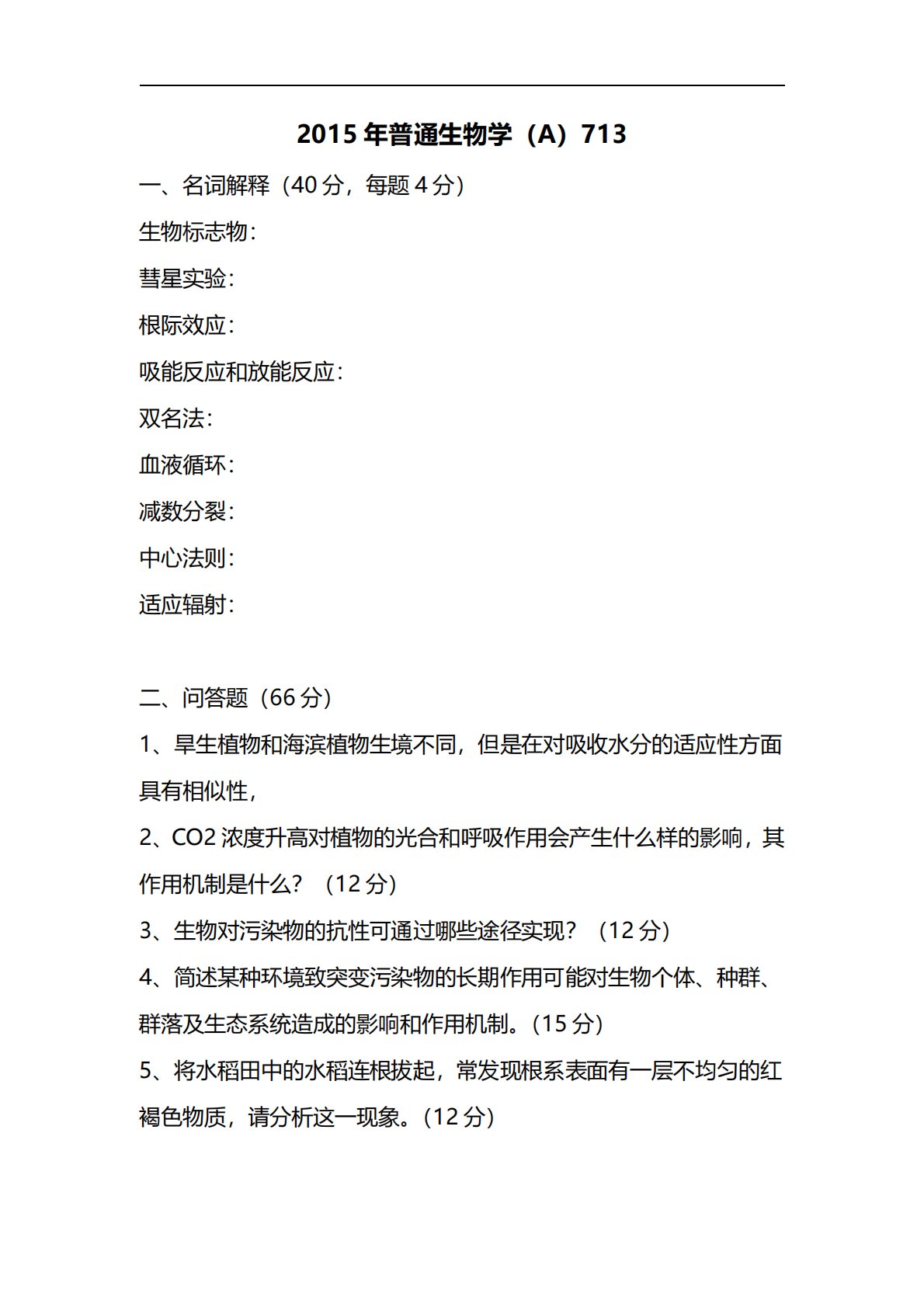 2015年普通生物学(A)713一、名词解释(40分,每题4分)生物标志物:彗星实验:根际效应:吸能反应和放能反应:双名法:血液循环:减数分裂:中心法则:适应辐射:二、问答题(66分)1、旱生植物和海滨植物生境不同,但是在对吸收水分的适应性方面具有相似性,2、CO2浓度升高对植物的光合和呼吸作用会产生什么样的影响,其作用机制是什么?(12分)3、生物对污染物的抗性可通过哪些途径实现?(12分)4、简述某种环境致突变污染物的长期作用可能对生物个体、种群、群落及生态系统造成的影响和作用机制。(15分)5、将水稻田中的水稻连根拔起,常发现根系表面有一层不均匀的红褐色物质,请分析这一现象。(12分)三...