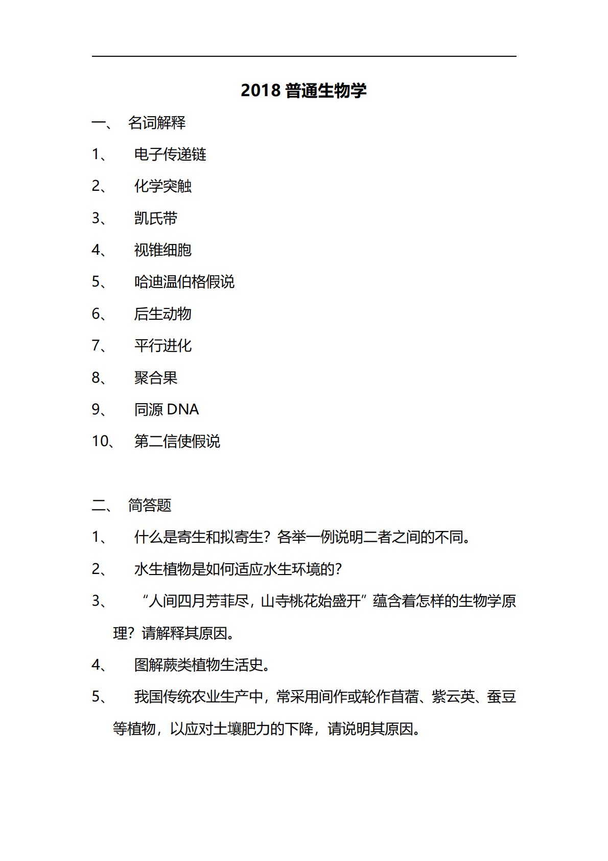 2018普通生物学一、名词解释1、电子传递链2、化学突触3、凯氏带4、视锥细胞5、哈迪温伯格假说6、后生动物7、平行进化8、聚合果9、同源DNA10、第二信使假说二、简答题1、什么是寄生和拟寄生?各举一例说明二者之间的不同。2、水生植物是如何适应水生环境的?3、“人间四月芳菲尽,山寺桃花始盛开”蕴含着怎样的生物学原理?请解释其原因。4、图解蕨类植物生活史。5、我国传统农业生产中,常采用间作或轮作苜蓿、紫云英、蚕豆等植物,以应对土壤肥力的下降,请说明其原因。三、问答题1、在一些极端环境条件下(高温干旱)哪些植物最可能成为人类的主要食物,并说明原因。2、生物多样性包括哪几个层次?论述全球环境变化对...
