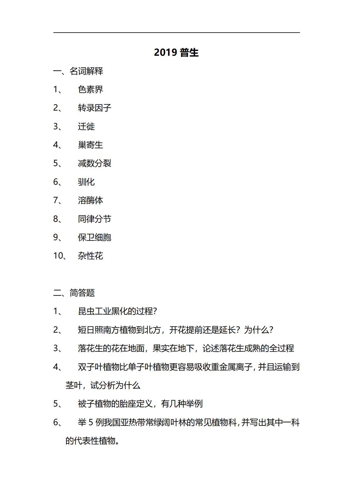 2019普生一、名词解释1、色素界2、转录因子3、迁徙4、巢寄生5、减数分裂6、驯化7、溶酶体8、同律分节9、保卫细胞10、杂性花二、简答题1、昆虫工业黑化的过程?2、短日照南方植物到北方,开花提前还是延长?为什么?3、落花生的花在地面,果实在地下,论述落花生成熟的全过程4、双子叶植物比单子叶植物更容易吸收重金属离子,并且运输到茎叶,试分析为什么5、被子植物的胎座定义,有几种举例6、举5例我国亚热带常绿阔叶林的常见植物科,并写出其中一科的代表性植物。三、论述题1、如何保护生物多样性2、利他作用的意义,和适合度的关系百校文库—海量高校资料共享库百校文库是一个线上大学生专业学习资料共享平台,致力于...
