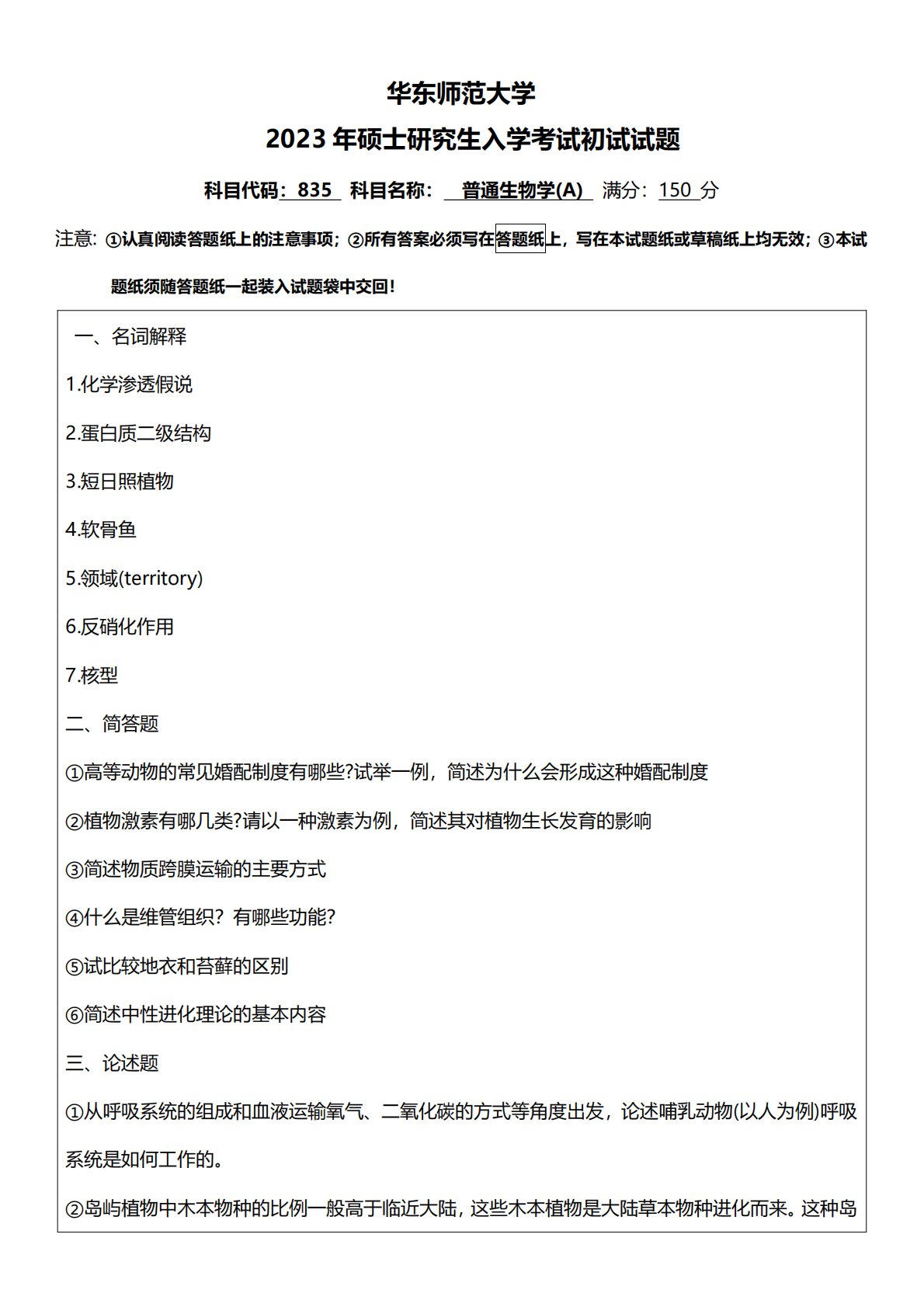 华东师范大学2023年硕士研究生入学考试初试试题科目代码:835科目名称:普通生物学(A)满分:150分注意:①认真阅读答题纸上的注意事项;②所有答案必须写在答题纸上,写在本试题纸或草稿纸上均无效;③本试题纸须随答题纸一起装入试题袋中交回!一、名词解释1.化学渗透假说2.蛋白质二级结构3.短日照植物4.软骨鱼5.领域(territory)6.反硝化作用7.核型二、简答题①高等动物的常见婚配制度有哪些?试举一例,简述为什么会形成这种婚配制度②植物激素有哪几类?请以一种激素为例,简述其对植物生长发育的影响③简述物质跨膜运输的主要方式④什么是维管组织?有哪些功能?⑤试比较地衣和苔藓的区别⑥简述中性进...