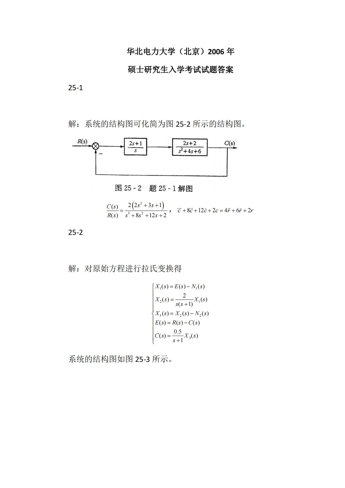 华北电力大学(北京)2006年硕士研究生入学考试试题答案25-1解:系统的结构图可化简为图25-2所示的结构图。2322231()()8122ssCsRssss,8122462ccccrrr25-2解:对原始方程进行拉氏变换得11213223()()()2()()(1)()()()()()()0.5()()1XsEsNsXsXsssXsXsNsEsRsCsCsXss系统的结构图如图25-3所示。2N1121(1)()()11(1)ssEsNsss,11()Nss,2N1211(1)()11(1)...