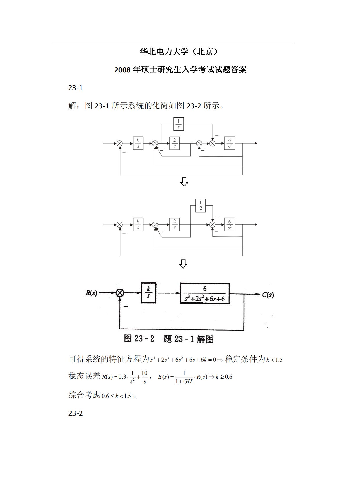 华北电力大学(北京)2008年硕士研究生入学考试试题答案23-1解:图23-1所示系统的化简如图23-2所示。可得系统的特征方程为43226660ssssk稳定条件为1.5k稳态误差2110()0.3Rsss,1()()0.61EsRskGH综合考虑0.61.5k。23-2解:124()12sGss,2()2()()4CsGsXss222122224221(4)4(2)1(2)4GEssNGGssssss2110100ntt,13221100()10Nssss2ssn123202211001lim...