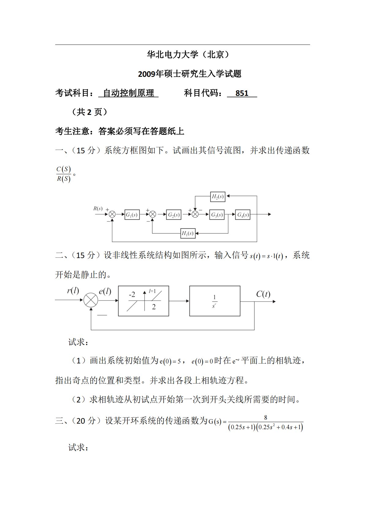 华北电力大学(北京)2009年硕士研究生入学试题考试科目:自动控制原理科目代码:851(共2页)考生注意:答案必须写在答题纸上一、(15分)系统方框图如下。试画出其信号流图,并求出传递函数CSRS。二、(15分)设非线性系统结构如图所示,输入信号1stst,系统开始是静止的。试求:(1)画出系统初始值为e05,00e时在ee平面上的相轨迹,指出奇点的位置和类型。并求出各段上相轨迹方程。(2)求相轨迹从初试点开始第一次到开头关线所需要的时间。三、(20分)设某开环系统的传递函数为28Gs0.2510.250.41sss试求:(1)试绘制该开环...