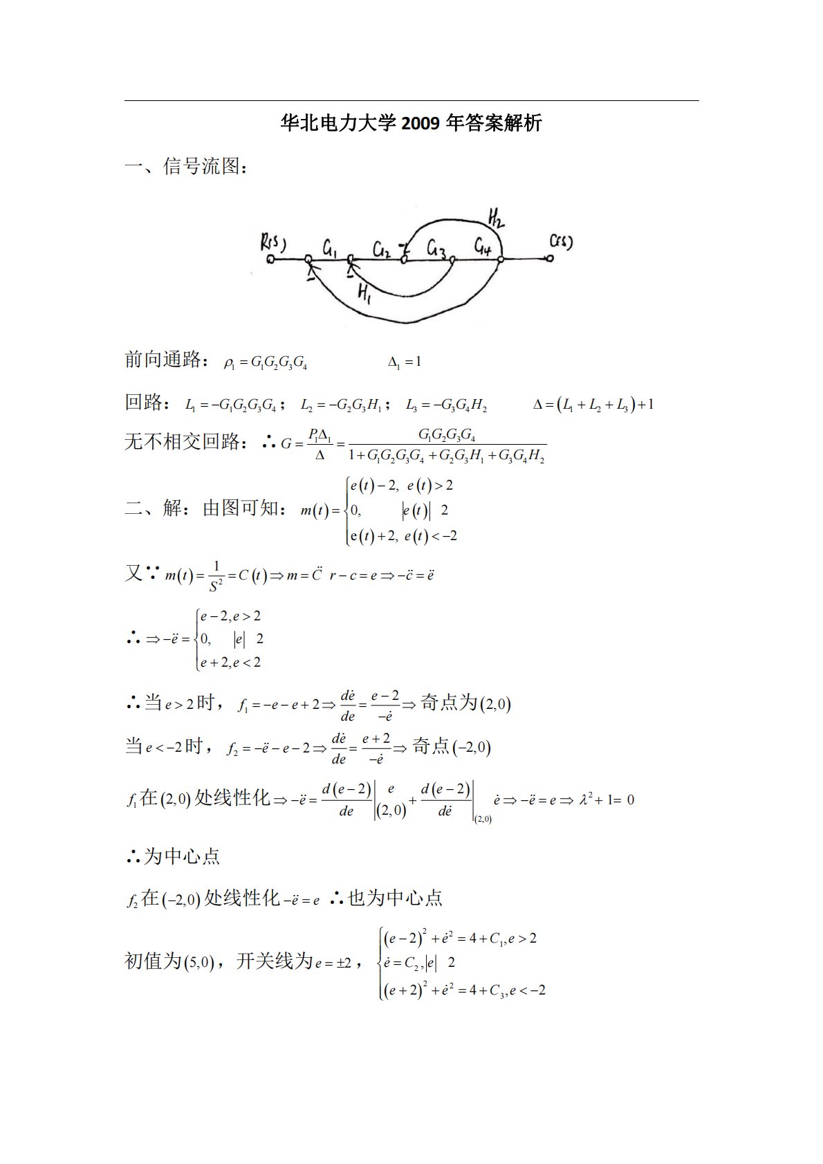 华北电力大学2009年答案解析一、信号流图:前向通路:11234GGGG11回路:11234LGGGG;2231LGGH;3342LGGH1231LLL无不相交回路:∴12341112342313421GGGGPGGGGGGGHGGH二、解:由图可知:2,20,2e2,2etetmtettet又∵21mtCtmCSrcece∴2,20,22,2eeeeee∴当2e时,122deefeedee奇点为2,0当...