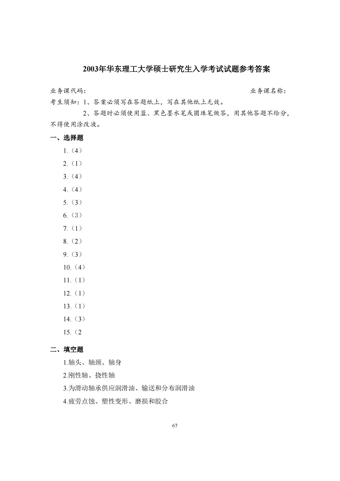 672003年华东理工大学硕士研究生入学考试试题参考答案业务课代码:业务课名称:考生须知:1、答案必须写在答题纸上,写在其他纸上无效。2、答题时必须使用蓝、黑色墨水笔或圆珠笔做答,用其他答题不给分,不得使用涂改液。一、选择题1.(4)2.(1)3.(4)4.(4)5.(3)6.(3)7.(1)8.(2)9.(3)10.(4)11.(1)12.(1)13.(1)14.(3)15.(2二、填空题1.轴头、轴颈、轴身2.刚性轴、挠性轴3.为滑动轴承供应润滑油、输送和分布润滑油4.疲劳点蚀、塑性变形、磨损和胶合685.106r、90%6.半均、瞬时7.相、不8.低、小9.齿数z,变位系数x三、分析、计...