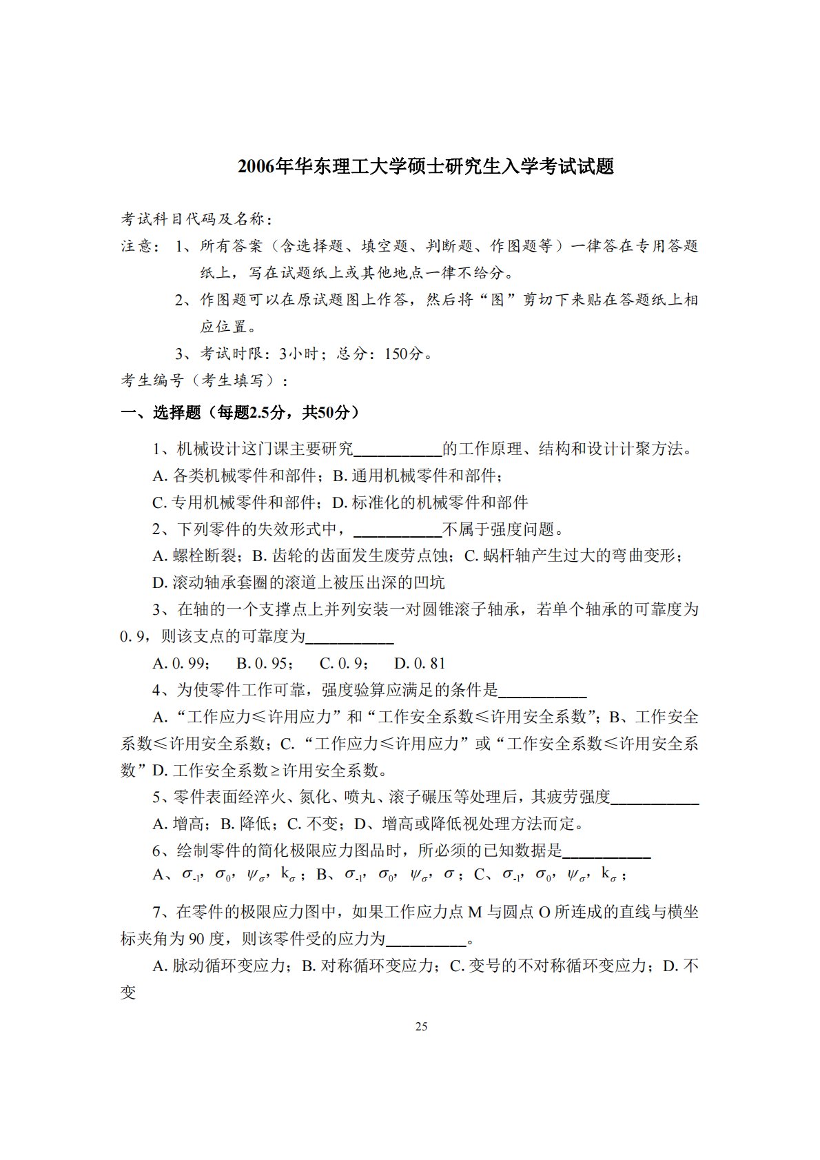 252006年华东理工大学硕士研究生入学考试试题考试科目代码及名称:注意:1、所有答案(含选择题、填空题、判断题、作图题等)一律答在专用答题纸上,写在试题纸上或其他地点一律不给分。2、作图题可以在原试题图上作答,然后将“图”剪切下来贴在答题纸上相应位置。3、考试时限:3小时;总分:150分。考生编号(考生填写):一、选择题(每题2.5分,共50分)1、机械设计这门课主要研究___________的工作原理、结构和设计计聚方法。A.各类机械零件和部件;B.通用机械零件和部件;C.专用机械零件和部件;D.标准化的机械零件和部件2、下列零件的失效形式中,___________不属于强度问题。A.螺栓...