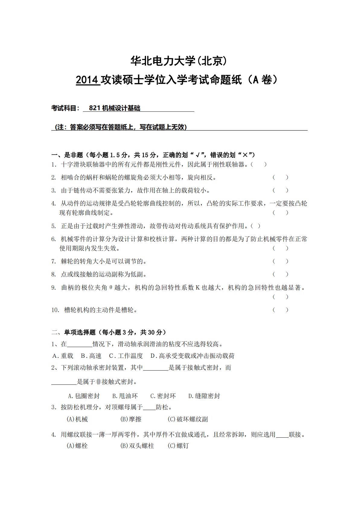 华北电力大学(北京)2014攻读硕士学位入学考试命题纸(A卷)考试科目:821机械设计基础(注:答案必须写在答题纸上,写在试题上无效)一、是非题(每小题1.5分,共15分,正确的划“√”,错误的划“×”)1.十字滑块联轴器中的所有元件都是刚性元件,因此属于刚性联轴器。()2.相啮合的蜗杆和蜗轮的螺旋角必须大小相等,旋向相反。()3.由于链传动不需要张紧力,故作用在轴上的载荷较小。()4.从动件的运动规律是受凸轮轮廓曲线控制的,所以,凸轮的实际工作要求,一定要按凸轮现有轮廓曲线制定。()5.正是由于过载时产生弹性滑动,故带传动对传动系统具有保护作用。()6.机械零件的计算分为设计计算和校核计算,...