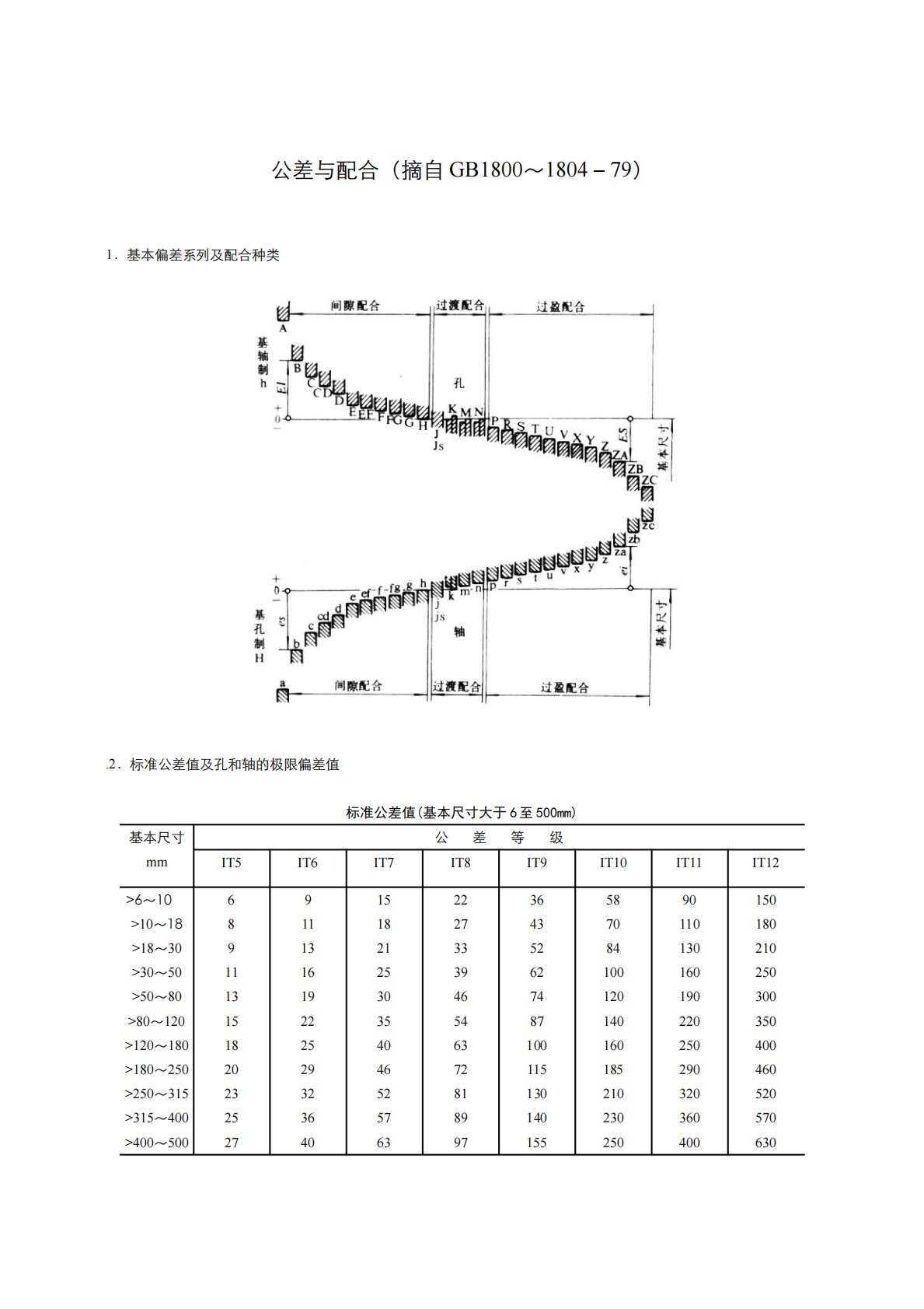 公差与配合(摘自GB1800~1804-79)1.基本偏差系列及配合种类.2.标准公差值及孔和轴的极限偏差值标准公差值(基本尺寸大于6至500mm)基本尺寸mm公差等级IT5IT6IT7IT8IT9IT10IT11IT12>6~10>10~18>18~30>30~50>50~80>80~120>120~180>180~250>250~315>315~400>400~50068911131518202325279111316192225293236401518212530354046525763222733394654637281899736435262748710011513014015558...