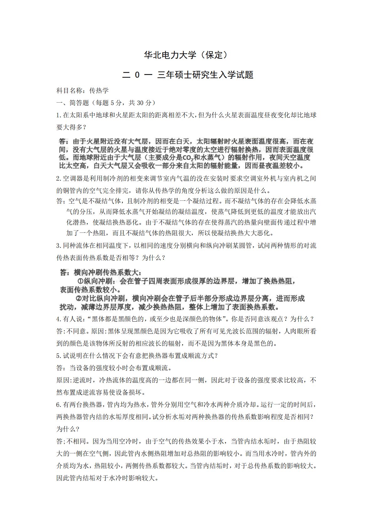 华北电力大学(保定)二O一三年硕士研究生入学试题科目名称:传热学一、简答题(每题5分,共30分)1.在太阳系中地球和火星距太阳的距离相差不大,但为什么火星表面温度昼夜变化却比地球要大得多?2.空调器是利用制冷剂的相变来调节室内气温的没在安装时要求空调室外机与室内机之间的铜管内的空气完全排完,请你从传热学的角度分析这么做的原因是什么。答;空气是不凝结气体,且制冷剂的相变是一个凝结过程。而不凝结气体的存在会降低水蒸气的分压,从而降低水蒸气开始凝结的凝结温度,使蒸气降低到更低的温度才能放出汽化潜热,使凝结换热恶化。由于不凝结气体的存在使得蒸汽的热量向壁面传递过程中增加了一个热阻,而且不凝结气体的热阻...