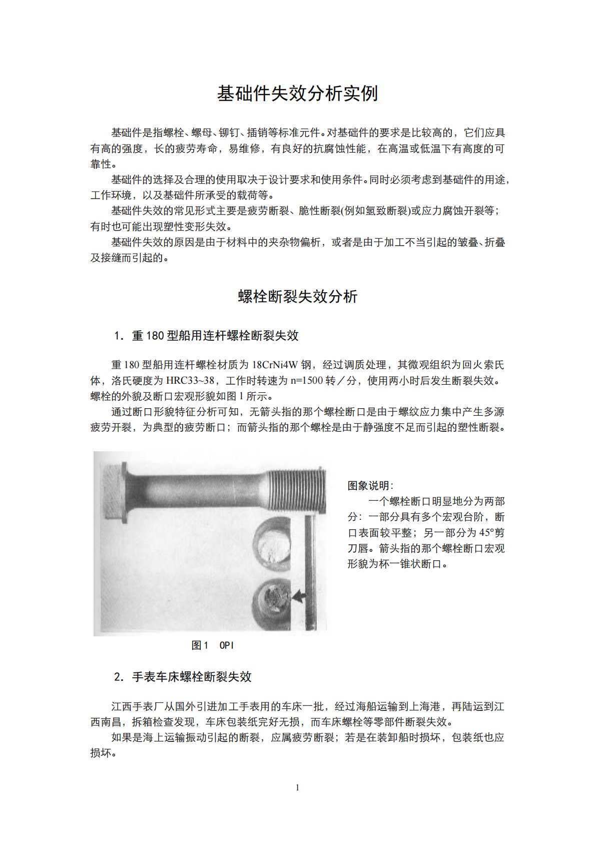 基础件失效分析实例基础件是指螺栓、螺母、铆钉、插销等标准元件。对基础件的要求是比较高的,它们应具有高的强度,长的疲劳寿命,易维修,有良好的抗腐蚀性能,在高温或低温下有高度的可靠性。基础件的选择及合理的使用取决于设计要求和使用条件。同时必须考虑到基础件的用途,工作环境,以及基础件所承受的载荷等。基础件失效的常见形式主要是疲劳断裂、脆性断裂(例如氢致断裂)或应力腐蚀开裂等;有时也可能出现塑性变形失效。基础件失效的原因是由于材料中的夹杂物偏析,或者是由于加工不当引起的皱叠、折叠及接缝而引起的。螺栓断裂失效分析1.重180型船用连杆螺栓断裂失效重180型船用连杆螺栓材质为18CrNi4W钢,经过调质处...