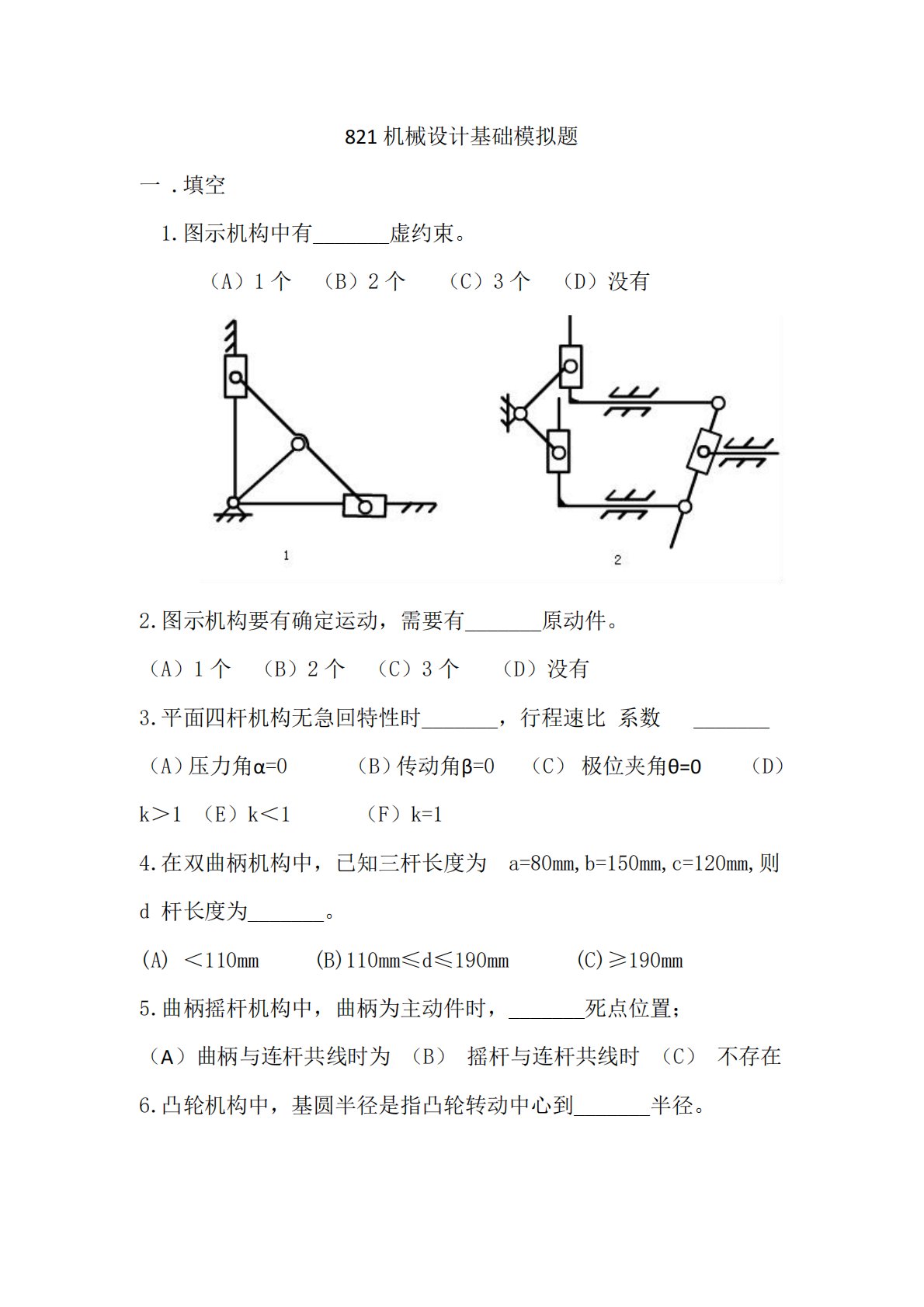 821机械设计基础模拟题一.填空1.图示机构中有_______虚约束。(A)1个(B)2个(C)3个(D)没有2.图示机构要有确定运动,需要有_______原动件。(A)1个(B)2个(C)3个(D)没有3.平面四杆机构无急回特性时_______,行程速比系数_______(A)压力角α=0(B)传动角β=0(C)极位夹角θ=0(D)k>1(E)k<1(F)k=14.在双曲柄机构中,已知三杆长度为a=80mm,b=150mm,c=120mm,则d杆长度为_______。(A)<110mm(B)110mm≤d≤190mm(C)≥190mm5.曲柄摇杆机构中,曲柄为主动件时,_______死点位置...