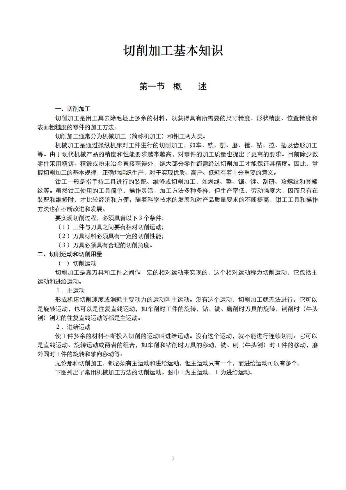 切削加工基本知识第一节概述一、切削加工切削加工是用工具去除毛坯上多余的材料,以获得具有所需要的尺寸精度、形状精度、位置精度和表面粗糙度的零件的加工方法。切削加工通常分为机械加工(简称机加工)和钳工两大类。机械加工是通过操纵机床对工件进行的切削加工,如车、铣、刨、磨、镗、钻、拉、插及齿形加工等。由于现代机械产品的精度和性能要求越来越高,对零件的加工质量也提出了更高的要求。目前除少数零件采用精铸、精锻或粉末冶金直接获得外,绝大部分零件都需经过切削加工才能保证其精度。因此,掌握切削加工的基本规律,正确地组织生产,对于实现优质、高产、低耗有着十分重要的意义。钳工一般是指手持工具进行的装配、维修或切削加...