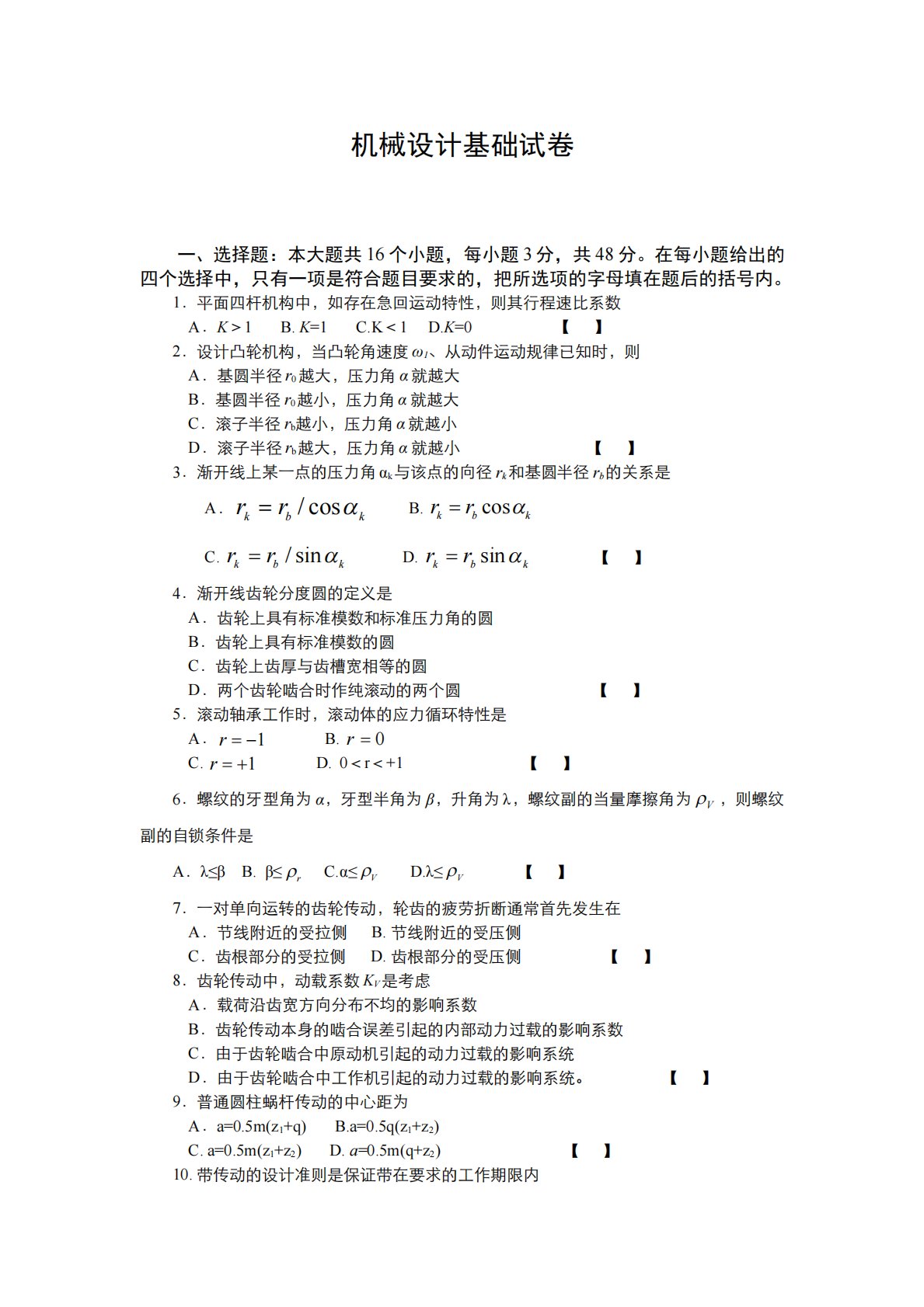 机械设计基础试卷一、选择题:本大题共16个小题,每小题3分,共48分。在每小题给出的四个选择中,只有一项是符合题目要求的,把所选项的字母填在题后的括号内。1.平面四杆机构中,如存在急回运动特性,则其行程速比系数A.K>1B.K=1C.K<1D.K=0【】2.设计凸轮机构,当凸轮角速度ω1、从动件运动规律已知时,则A.基圆半径r0越大,压力角α就越大B.基圆半径r0越小,压力角α就越大C.滚子半径rb越小,压力角α就越小D.滚子半径rb越大,压力角α就越小【】3.渐开线上某一点的压力角αk与该点的向径rk和基圆半径rb的关系是A.kbkrrcos/B.kbkrrcosC.kbkrrsi...
