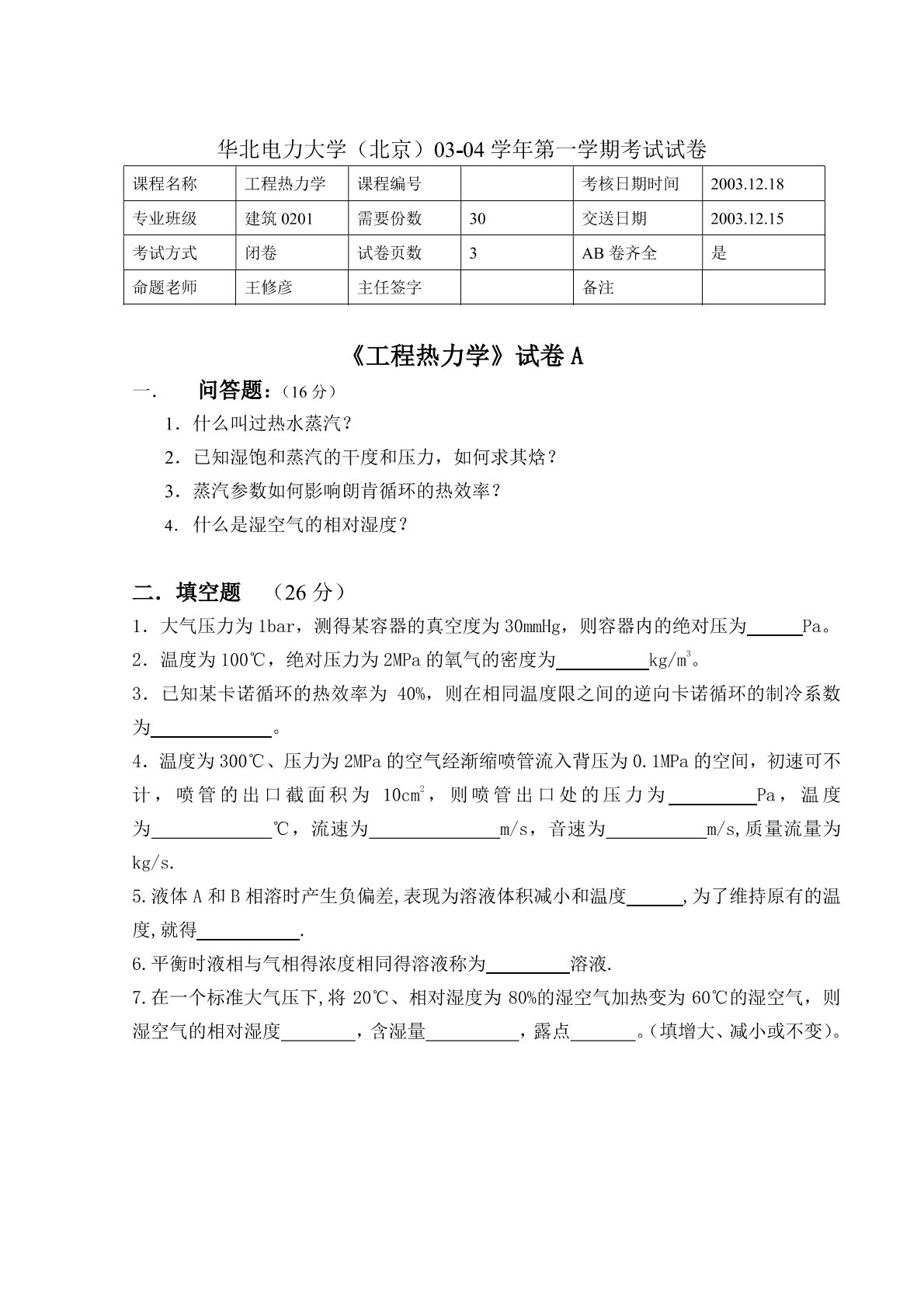 华北电力大学(北京)823热工基础2003-2004年第一学期期末试卷A