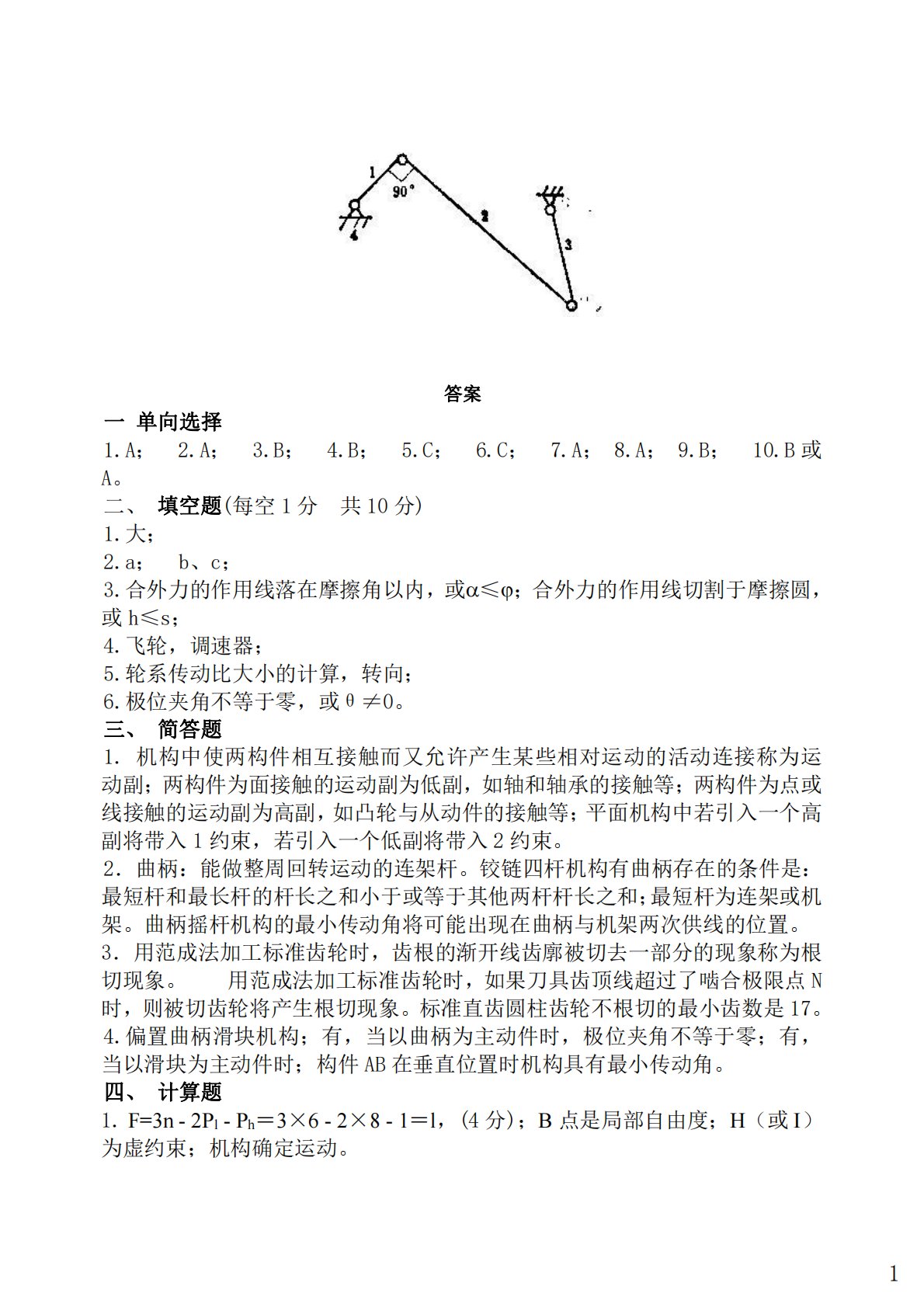 答案一单向选择1.A;2.A;3.B;4.B;5.C;6.C;7.A;8.A;9.B;10.B或A。二、填空题(每空1分共10分)1.大;2.a;b、c;3.合外力的作用线落在摩擦角以内,或≤;合外力的作用线切割于摩擦圆,或h≤s;4.飞轮,调速器;5.轮系传动比大小的计算,转向;6.极位夹角不等于零,或θ≠0。三、简答题1.机构中使两构件相互接触而又允许产生某些相对运动的活动连接称为运动副;两构件为面接触的运动副为低副,如轴和轴承的接触等;两构件为点或线接触的运动副为高副,如凸轮与从动件的接触等;平面机构中若引入一个高副将带入1约束,若引入一个低副将带入2约束。2.曲柄:能做整周回转运动...
