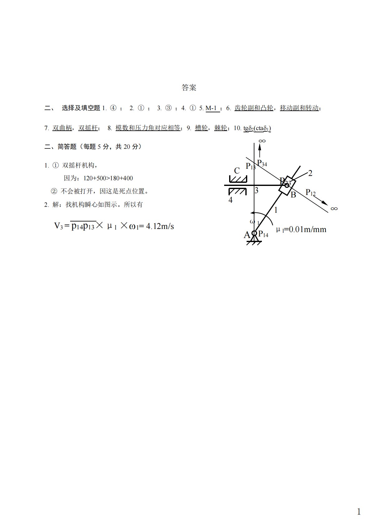 答案二、选择及填空题1.④;2.①;3.③;4.①5.M-1;6.齿轮副和凸轮,移动副和转动;7.双曲柄,双摇杆;8.模数和压力角对应相等;9.槽轮,棘轮;10.tg(cta)二、简答题(每题5分,共20分)1.①双摇杆机构,因为:120+500>180+400②不会被打开,因这是死点位置。2.解:找机构瞬心如图示。所以有V3=pp×μl×=4.12m/sP14P12∞∞P34P13μl=0.01m/mm2Cω1A1B34P2313.解4.是静平衡的。因为W1=W2=120kg•mm,且方向相反。不是动平衡的。因为不在同一回转平面内,将产生惯性力矩。三、解:5.轮系类型;...