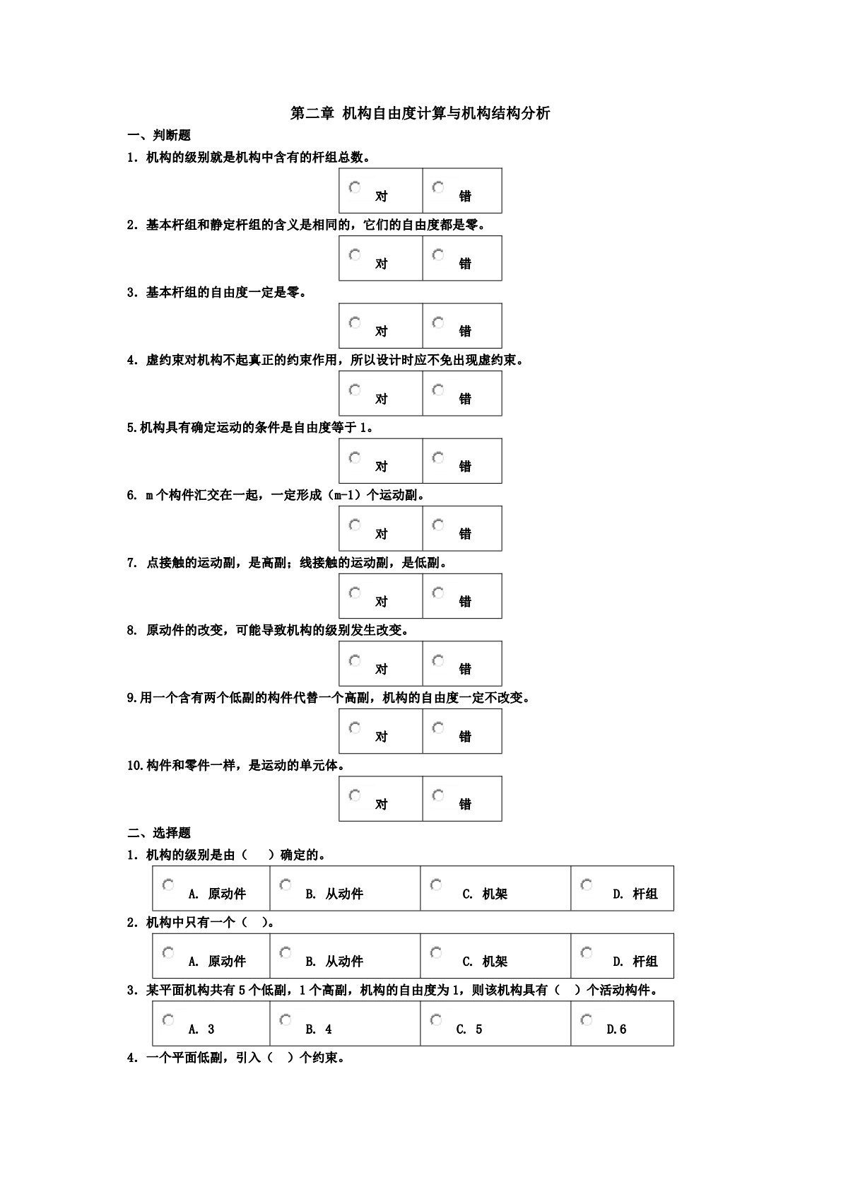 第二章机构自由度计算与机构结构分析一、判断题1.机构的级别就是机构中含有的杆组总数。对错2.基本杆组和静定杆组的含义是相同的,它们的自由度都是零。对错3.基本杆组的自由度一定是零。对错4.虚约束对机构不起真正的约束作用,所以设计时应不免出现虚约束。对错5.机构具有确定运动的条件是自由度等于1。对错6.m个构件汇交在一起,一定形成(m-1)个运动副。对错7.点接触的运动副,是高副;线接触的运动副,是低副。对错8.原动件的改变,可能导致机构的级别发生改变。对错9.用一个含有两个低副的构件代替一个高副,机构的自由度一定不改变。对错10.构件和零件一样,是运动的单元体。对错二、选择题1.机构的级别是由...