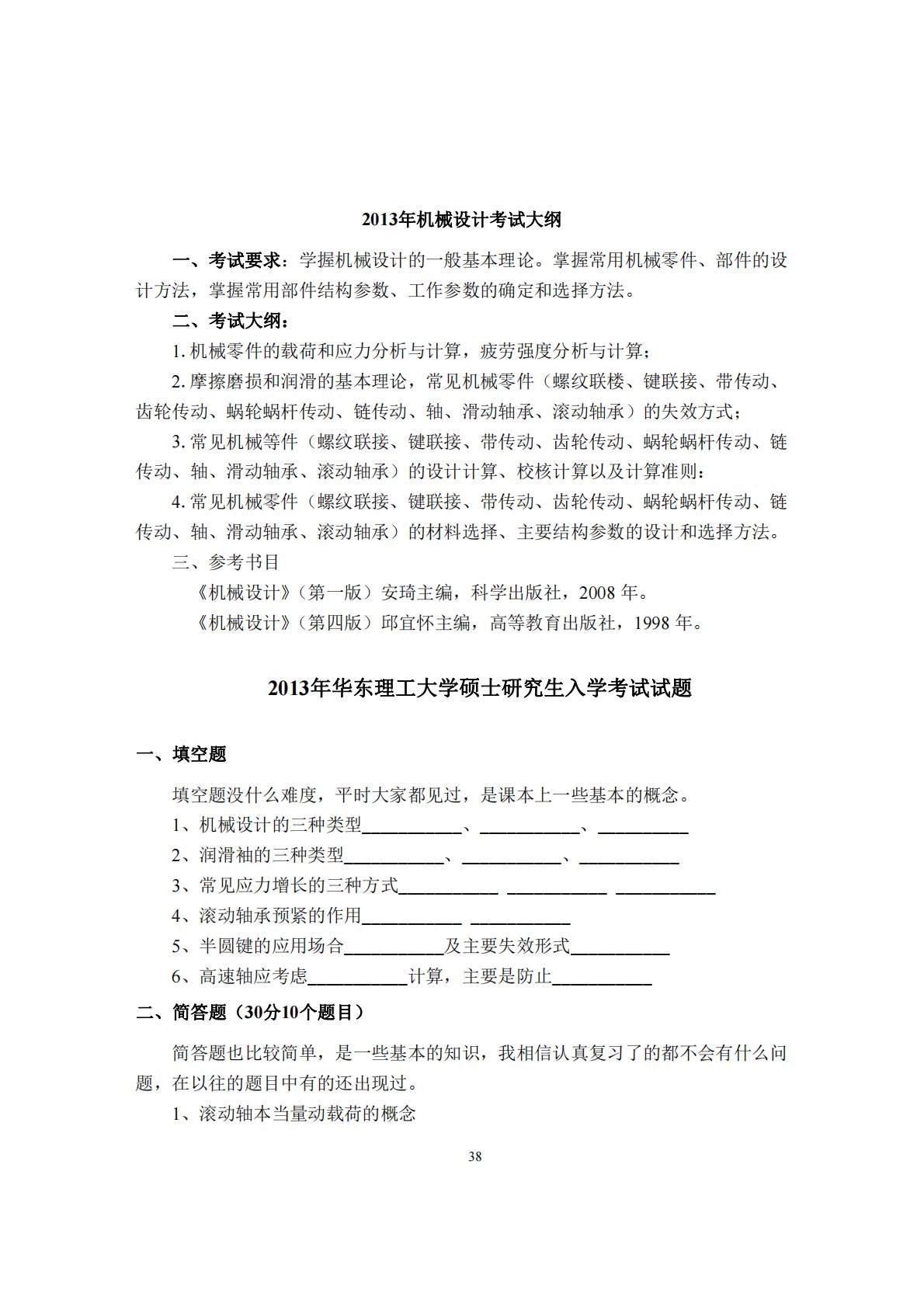382013年机械设计考试大纲一、考试要求:学握机械设计的一般基本理论。掌握常用机械零件、部件的设计方法,掌握常用部件结构参数、工作参数的确定和选择方法。二、考试大纲:1.机械零件的载荷和应力分析与计算,疲劳强度分析与计算;2.摩擦磨损和润滑的基本理论,常见机械零件(螺纹联楼、键联接、带传动、齿轮传动、蜗轮蜗杆传动、链传动、轴、滑动轴承、滚动轴承)的失效方式;3.常见机械等件(螺纹联接、键联接、带传动、齿轮传动、蜗轮蜗杆传动、链传动、轴、滑动轴承、滚动轴承)的设计计算、校核计算以及计算准则:4.常见机械零件(螺纹联接、键联接、带传动、齿轮传动、蜗轮蜗杆传动、链传动、轴、滑动轴承、滚动轴承)的材...