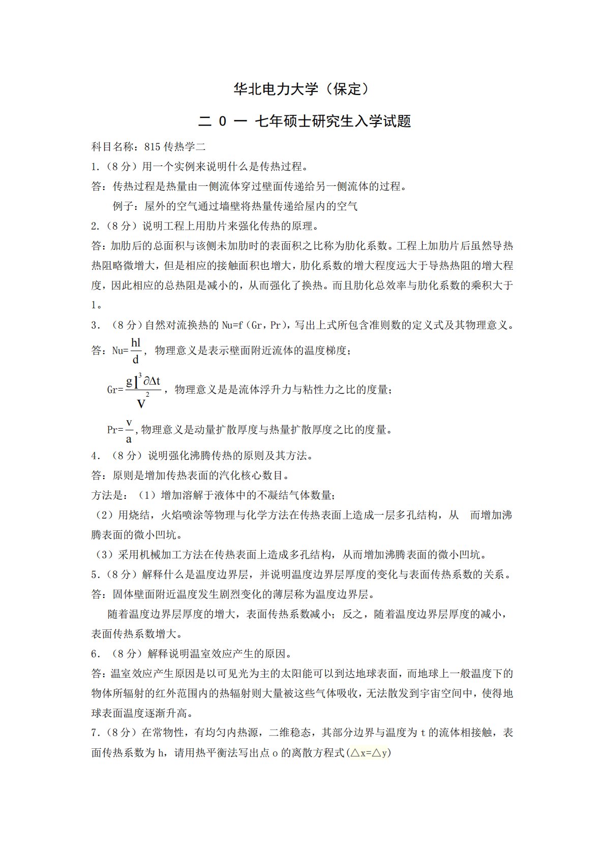 华北电力大学(保定)二O一七年硕士研究生入学试题科目名称:815传热学二1.(8分)用一个实例来说明什么是传热过程。答:传热过程是热量由一侧流体穿过壁面传递给另一侧流体的过程。例子:屋外的空气通过墙壁将热量传递给屋内的空气2.(8分)说明工程上用肋片来强化传热的原理。答:加肋后的总面积与该侧未加肋时的表面积之比称为肋化系数。工程上加肋片后虽然导热热阻略微增大,但是相应的接触面积也增大,肋化系数的增大程度远大于导热热阻的增大程度,因此相应的总热阻是减小的,从而强化了换热。而且肋化总效率与肋化系数的乘积大于1。3.(8分)自然对流换热的Nu=f(Gr,Pr),写出上式所包含准则数的定义式及其物理意...