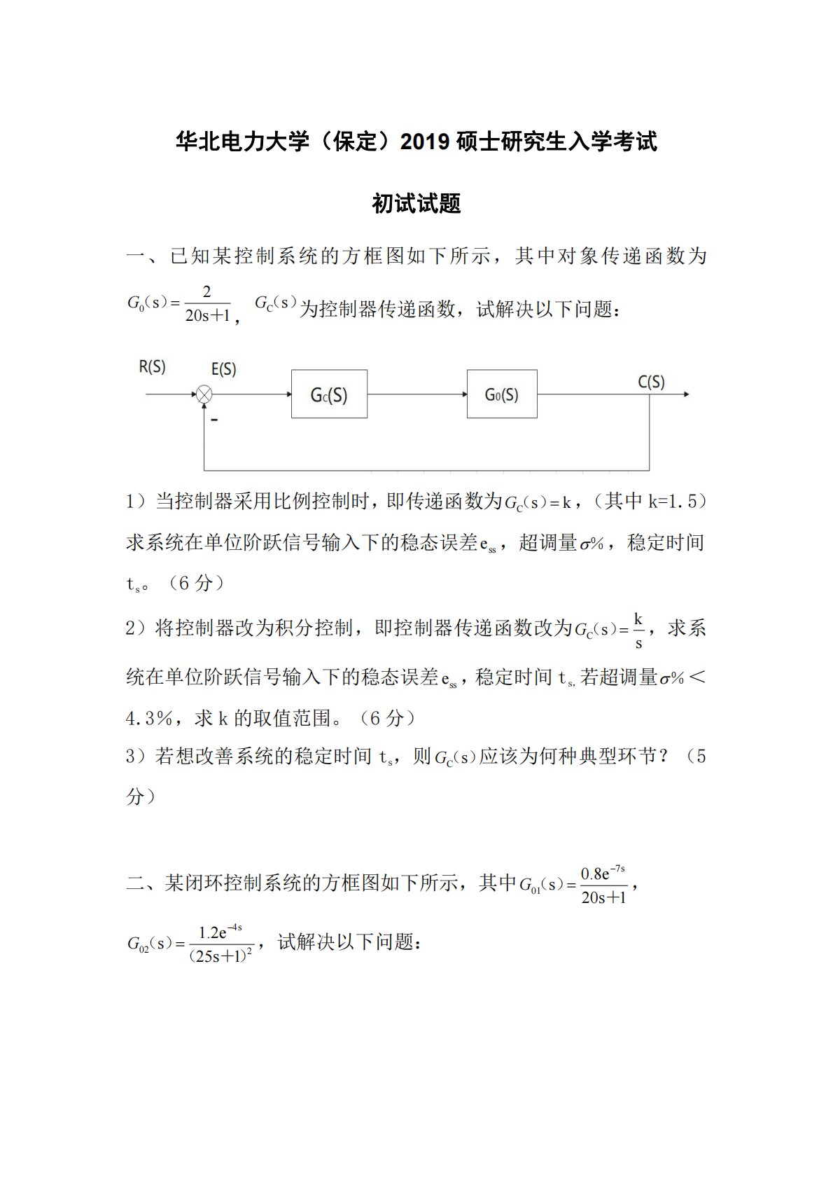 华北电力大学(保定)2019硕士研究生入学考试初试试题一、已知某控制系统的方框图如下所示,其中对象传递函数为1s202s0+)(G,)(sCG为控制器传递函数,试解决以下问题:1)当控制器采用比例控制时,即传递函数为ksC)(G,(其中k=1.5)求系统在单位阶跃信号输入下的稳态误差sse,超调量%,稳定时间ts。(6分)2)将控制器改为积分控制,即控制器传递函数改为sksC)(G,求系统在单位阶跃信号输入下的稳态误差sse,稳定时间ts,若超调量%<4.3%,求k的取值范围。(6分)3)若想改善系统的稳定时间ts,则)(sCG应该为何种典型环节?(5分)二、某闭环控制系统的方框图如...