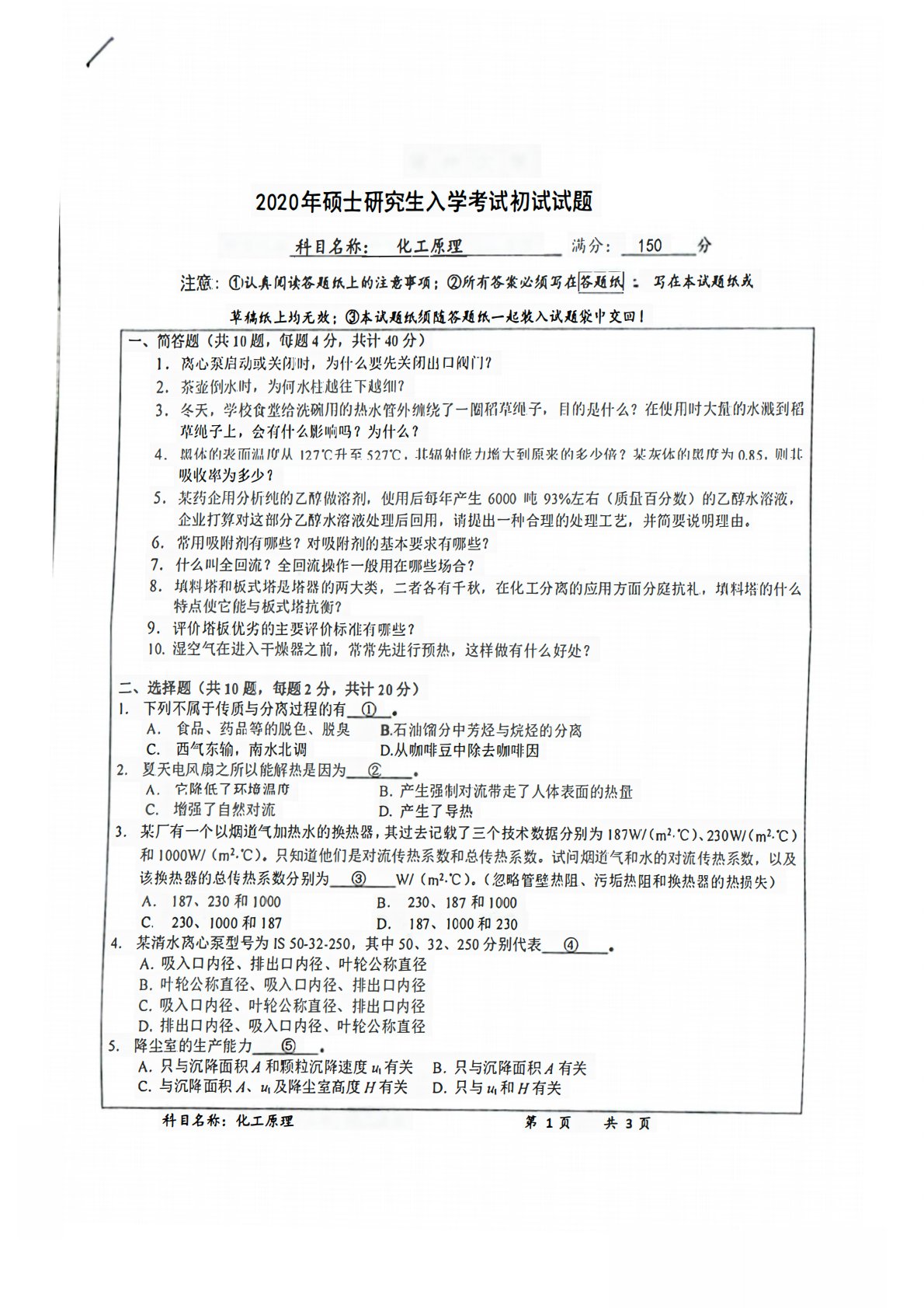 2020年硕士研究生入学考试初试试题满分科目名称:化工原理:150写在本试题纸或注意:①认真阅读答题纸上的注意事项;②所有答案必须写在答题纸草稿纸上均无效;③本试题纸须随答题纸一起装入试题袋中交回!一、简答题(共10题,每题4分,共计40分)1.离心泵启动或关闭时,为什么要先关闭出口阀门?2.茶壶倒水时,为何水柱越往下越细?3.冬天,学校食堂给洗碗用的热水管外缠绕了一圈稻草绳子,目的是什么?在使用时大量的水溅到稻草绳子上,会有什么影响吗?为什么?4.照体的表面温度从127℃升至527℃,其辐射能力增大到原来的多少倍?某灰体的黑度为0.85,则其吸收率为多少?5,某药企用分析纯的乙醇做溶剂,使用...