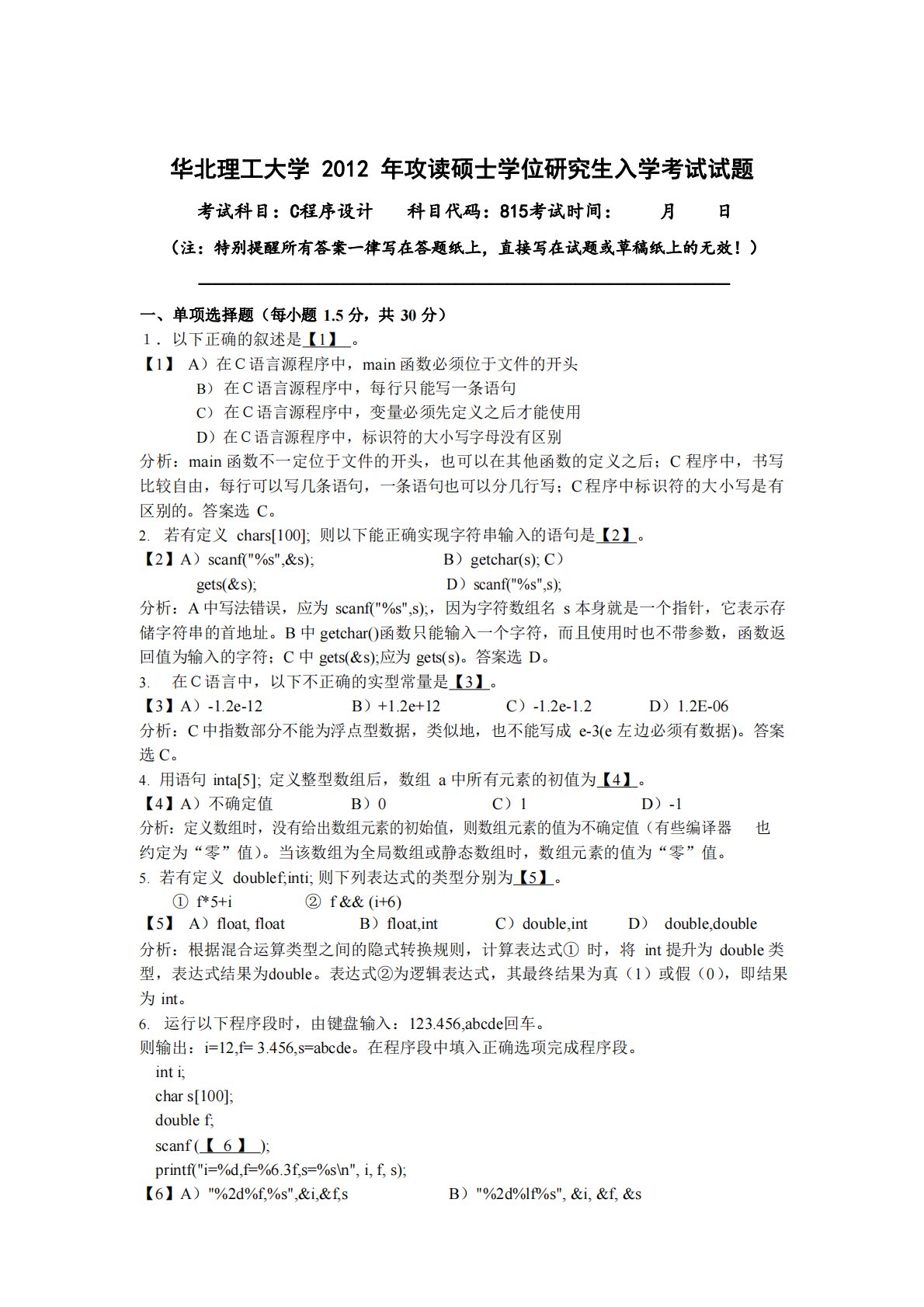 华北理工大学2012年815C程序设计考研真题及答案解析