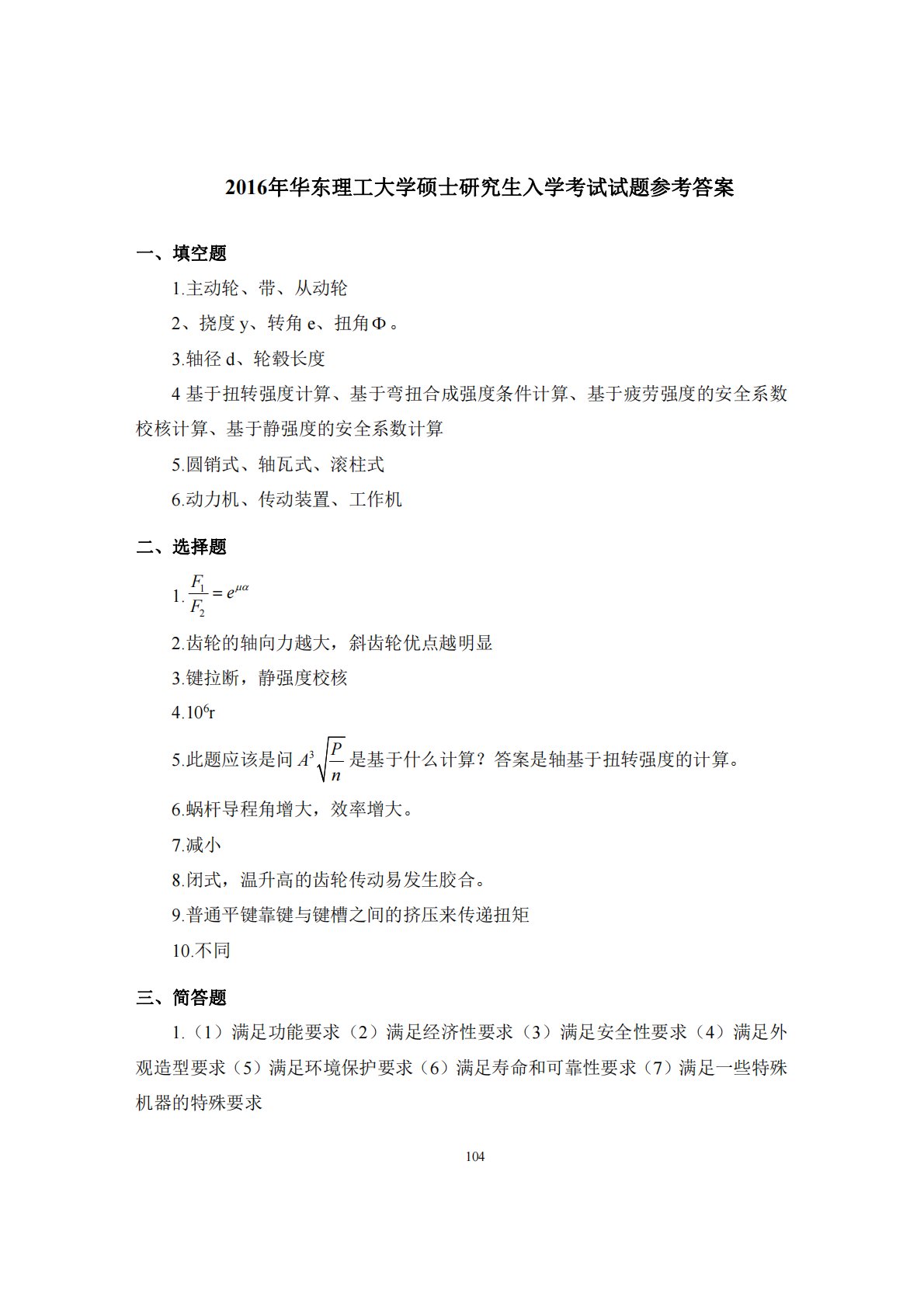 1042016年华东理工大学硕士研究生入学考试试题参考答案一、填空题1.主动轮、带、从动轮2、挠度y、转角e、扭角。3.轴径d、轮毂长度4基于扭转强度计算、基于弯扭合成强度条件计算、基于疲劳强度的安全系数校核计算、基于静强度的安全系数计算5.圆销式、轴瓦式、滚柱式6.动力机、传动装置、工作机二、选择题1.12FeF2.齿轮的轴向力越大,斜齿轮优点越明显3.键拉断,静强度校核4.106r5.此题应该是问3APn是基于什么计算?答案是轴基于扭转强度的计算。6.蜗杆导程角增大,效率增大。7.减小8.闭式,温升高的齿轮传动易发生胶合。9.普通平键靠键与键槽之间的挤压来传递扭矩10.不同三、简答...