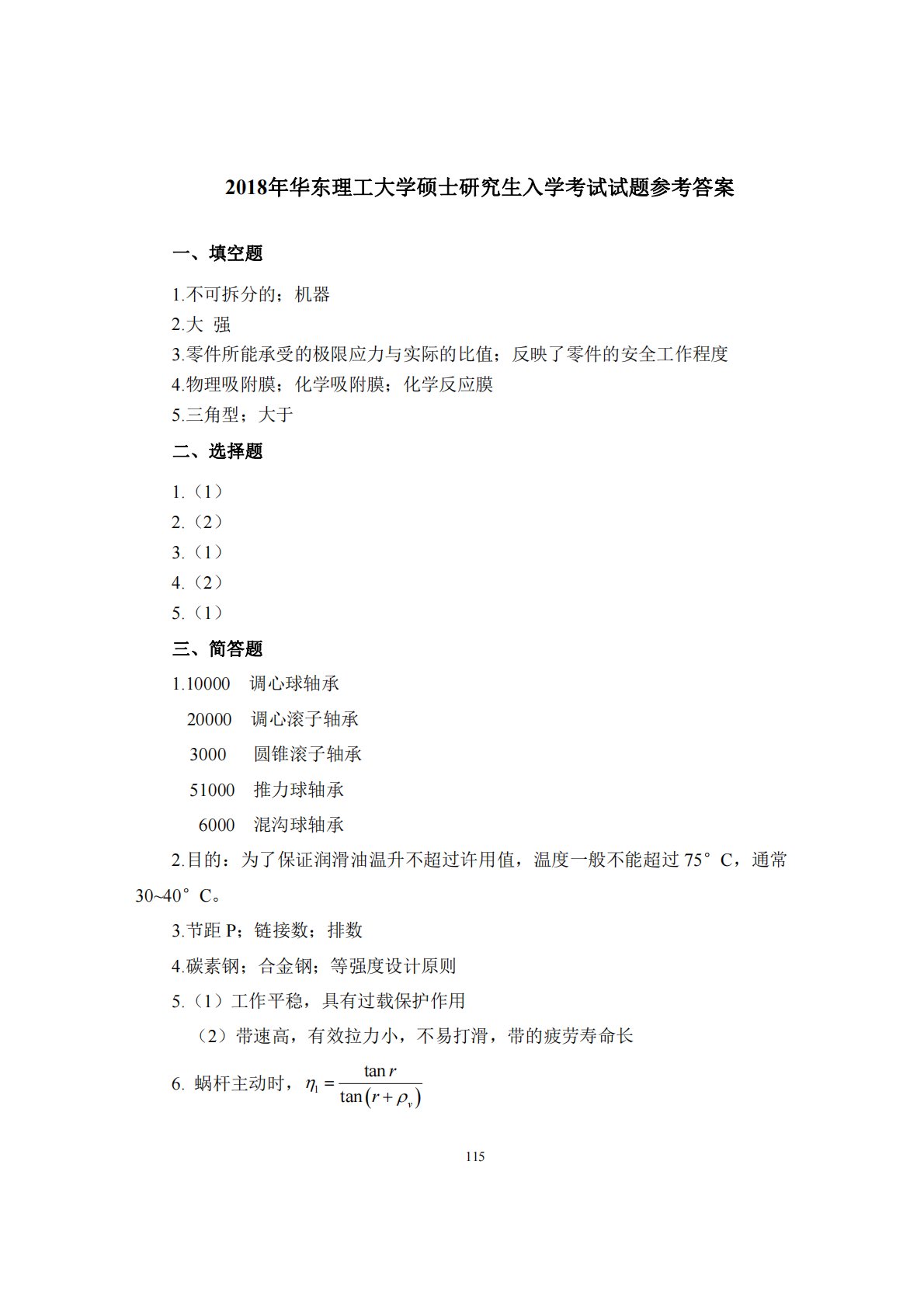 1152018年华东理工大学硕士研究生入学考试试题参考答案一、填空题1.不可拆分的;机器2.大强3.零件所能承受的极限应力与实际的比值;反映了零件的安全工作程度4.物理吸附膜;化学吸附膜;化学反应膜5.三角型;大于二、选择题1.(1)2.(2)3.(1)4.(2)5.(1)三、简答题1.10000调心球轴承20000调心滚子轴承3000圆锥滚子轴承51000推力球轴承6000混沟球轴承2.目的:为了保证润滑油温升不超过许用值,温度一般不能超过75°C,通常30~40°C。3.节距P;链接数;排数4.碳素钢;合金钢;等强度设计原则5.(1)工作平稳,具有过载保护作用(2)带速高,有效拉力小,不易...