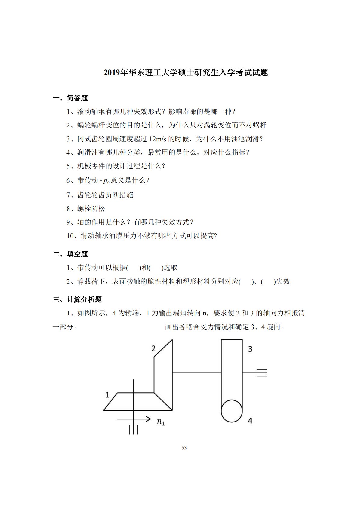 532019年华东理工大学硕士研究生入学考试试题一、简答题1、滚动轴承有哪几种失效形式?影响寿命的是哪一种?2、蜗轮蜗杆变位的目的是什么,为什么只对涡轮变位而不对蜗杆3、闭式齿轮圆周速度超过12m/s的时候,为什么不用油池润滑?4、润滑油有哪几种分类,最常用的是什么,对应什么指标?5、机械零件的设计过程是什么?6、带传动0p意义是什么?7、齿轮轮齿折断措施8、螺栓防松9、轴的作用是什么?有哪几种失效方式?10、滑动轴承油膜压力不够有哪些方式可以提高?二、填空题1、带传动可以根据()和()选取2、静载荷下,表面接触的脆性材料和塑形材料分别对应()、()失效.三、计算分析题1、如图所示,4为输端...
