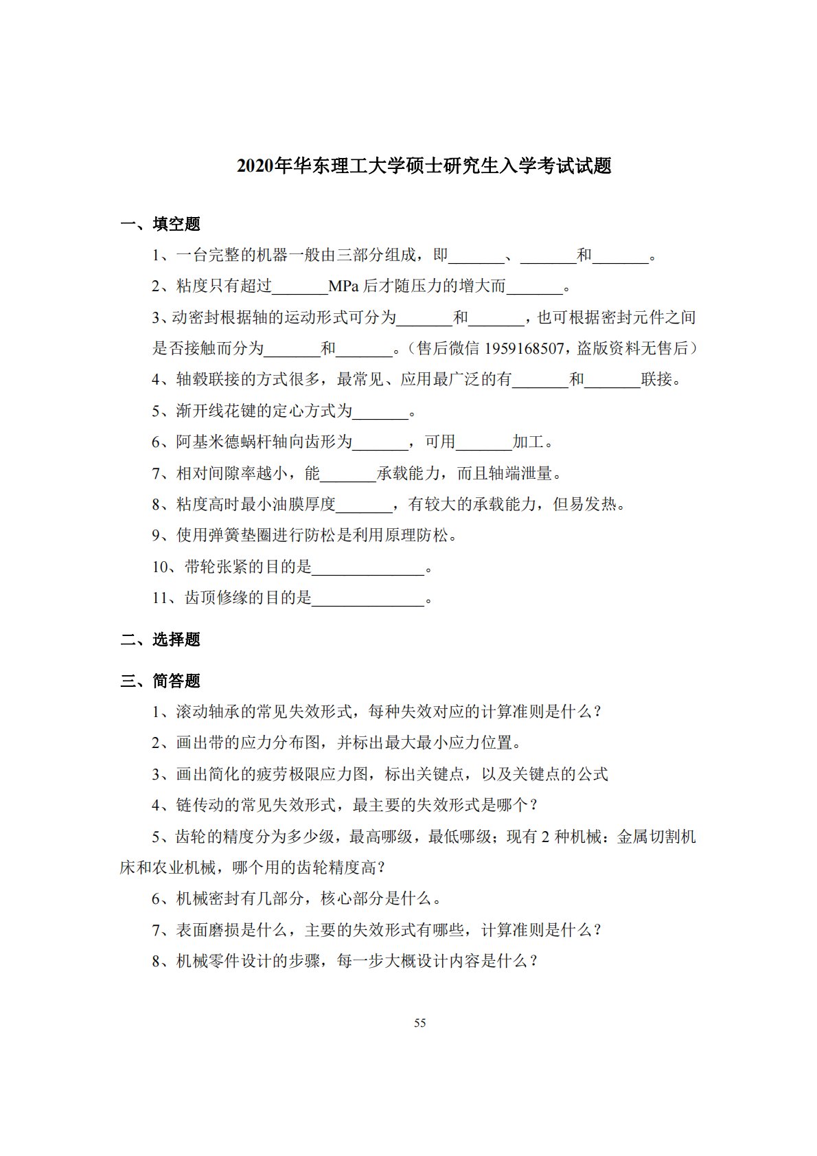 552020年华东理工大学硕士研究生入学考试试题一、填空题1、一台完整的机器一般由三部分组成,即_______、_______和_______。2、粘度只有超过_______MPa后才随压力的增大而_______。3、动密封根据轴的运动形式可分为_______和_______,也可根据密封元件之间是否接触而分为_______和_______。(售后微信1959168507,盗版资料无售后)4、轴毂联接的方式很多,最常见、应用最广泛的有_______和_______联接。5、渐开线花键的定心方式为_______。6、阿基米德蜗杆轴向齿形为_______,可用_______加工。7、相对间隙率越小...