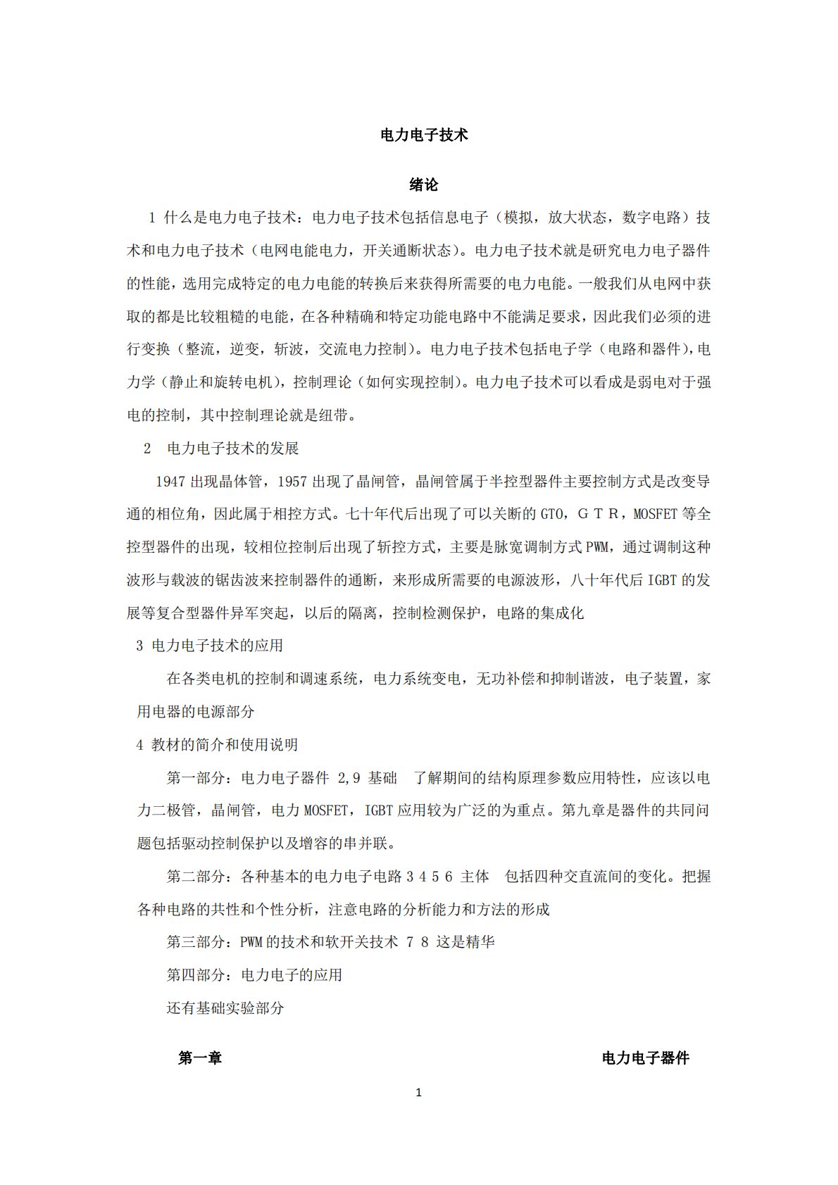 1电力电子技术绪论1什么是电力电子技术:电力电子技术包括信息电子(模拟,放大状态,数字电路)技术和电力电子技术(电网电能电力,开关通断状态)。电力电子技术就是研究电力电子器件的性能,选用完成特定的电力电能的转换后来获得所需要的电力电能。一般我们从电网中获取的都是比较粗糙的电能,在各种精确和特定功能电路中不能满足要求,因此我们必须的进行变换(整流,逆变,斩波,交流电力控制)。电力电子技术包括电子学(电路和器件),电力学(静止和旋转电机),控制理论(如何实现控制)。电力电子技术可以看成是弱电对于强电的控制,其中控制理论就是纽带。2电力电子技术的发展1947出现晶体管,1957出现了晶闸管,晶闸管属...