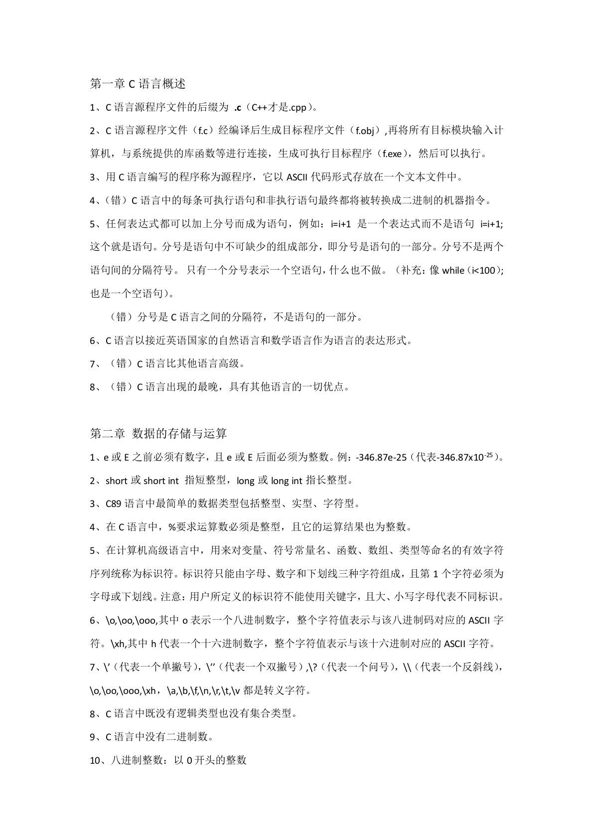 第一章C语言概述1、C语言源程序文件的后缀为.c(C++才是.cpp)。2、C语言源程序文件(f.c)经编译后生成目标程序文件(f.obj),再将所有目标模块输入计算机,与系统提供的库函数等进行连接,生成可执行目标程序(f.exe),然后可以执行。3、用C语言编写的程序称为源程序,它以ASCII代码形式存放在一个文本文件中。4、(错)C语言中的每条可执行语句和非执行语句最终都将被转换成二进制的机器指令。5、任何表达式都可以加上分号而成为语句,例如:i=i+1是一个表达式而不是语句i=i+1;这个就是语句。分号是语句中不可缺少的组成部分,即分号是语句的一部分。分号不是两个语句间的分隔符号。只有一...