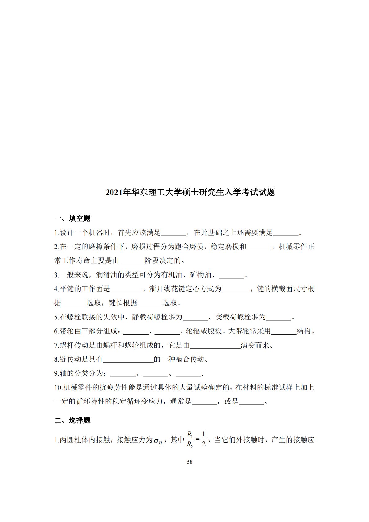 582021年华东理工大学硕士研究生入学考试试题一、填空题1.设计一个机器时,首先应该满足,在此基础之上还需要满足。2.在一定的磨擦条件下,磨损过程分为跑合磨损,稳定磨损和,机械零件正常工作寿命主要是由阶段决定的。3.一般来说,润滑油的类型可分为有机油、矿物油、。4.平键的工作面是,渐开线花键定心方式为,键的横截面尺寸根据选取,键长根据选取。5.在螺栓联接的失效中,静载荷螺栓多为,变载荷螺栓多为。6.带轮由三部分组成:、、轮辐或腹板。大带轮常采用结构。7.蜗杆传动是由蜗杆和蜗轮组成的,它是由演变而来。8.链传动是具有的一种啮合传动。9.轴的分类分为:、、。10.机械零件的抗疲劳性能是通过具体的...