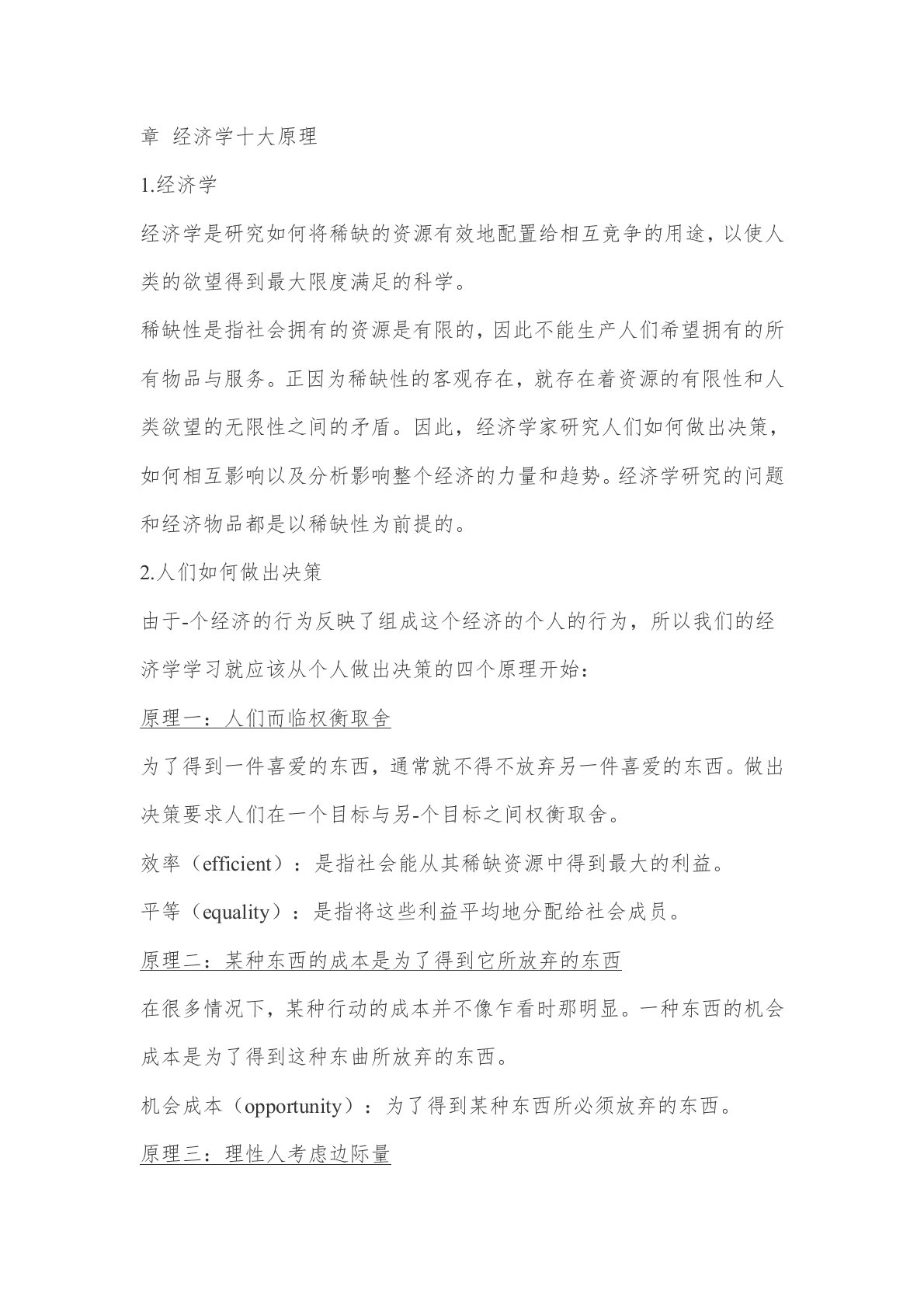 章经济学十大原理1.经济学经济学是研究如何将稀缺的资源有效地配置给相互竞争的用途,以使人类的欲望得到最大限度满足的科学。稀缺性是指社会拥有的资源是有限的,因此不能生产人们希望拥有的所有物品与服务。正因为稀缺性的客观存在,就存在着资源的有限性和人类欲望的无限性之间的矛盾。因此,经济学家研究人们如何做出决策,如何相互影响以及分析影响整个经济的力量和趋势。经济学研究的问题和经济物品都是以稀缺性为前提的。2.人们如何做出决策由于-个经济的行为反映了组成这个经济的个人的行为,所以我们的经济学学习就应该从个人做出决策的四个原理开始:原理一:人们而临权衡取舍为了得到一件喜爱的东西,通常就不得不放弃另一件喜爱...