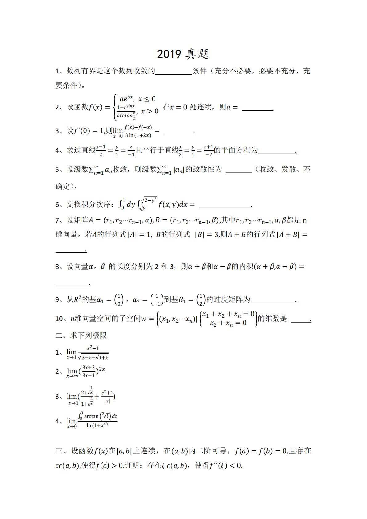 2019真题1、数列有界是这个数列收敛的条件(充分不必要,必要不充分,充要条件)。2、设函数=5,≤01−2,>0在=0处连续,则=.3、设´0=1,则lim→0−(−)3ln(1+2)=.4、求过直线−12=1=−1且平行于直线2=1=+1−2的平面方程为.5、设级数=1∞收敛,则级数=1∞||的敛散性为(收敛、发散、不确定)。6、交换积分次序:012−2,=.7、设矩阵=1,2⋯−1,,=(1,2⋯−1,),其中1,2⋯−1,,都是n维向量。若的行列式||=1,的行列式||=3,则+的行列式|+|=.8、设向量,的长度分别为2和3,则+和−的内积(+,−)=.9、从2的基1=10,2=1−...