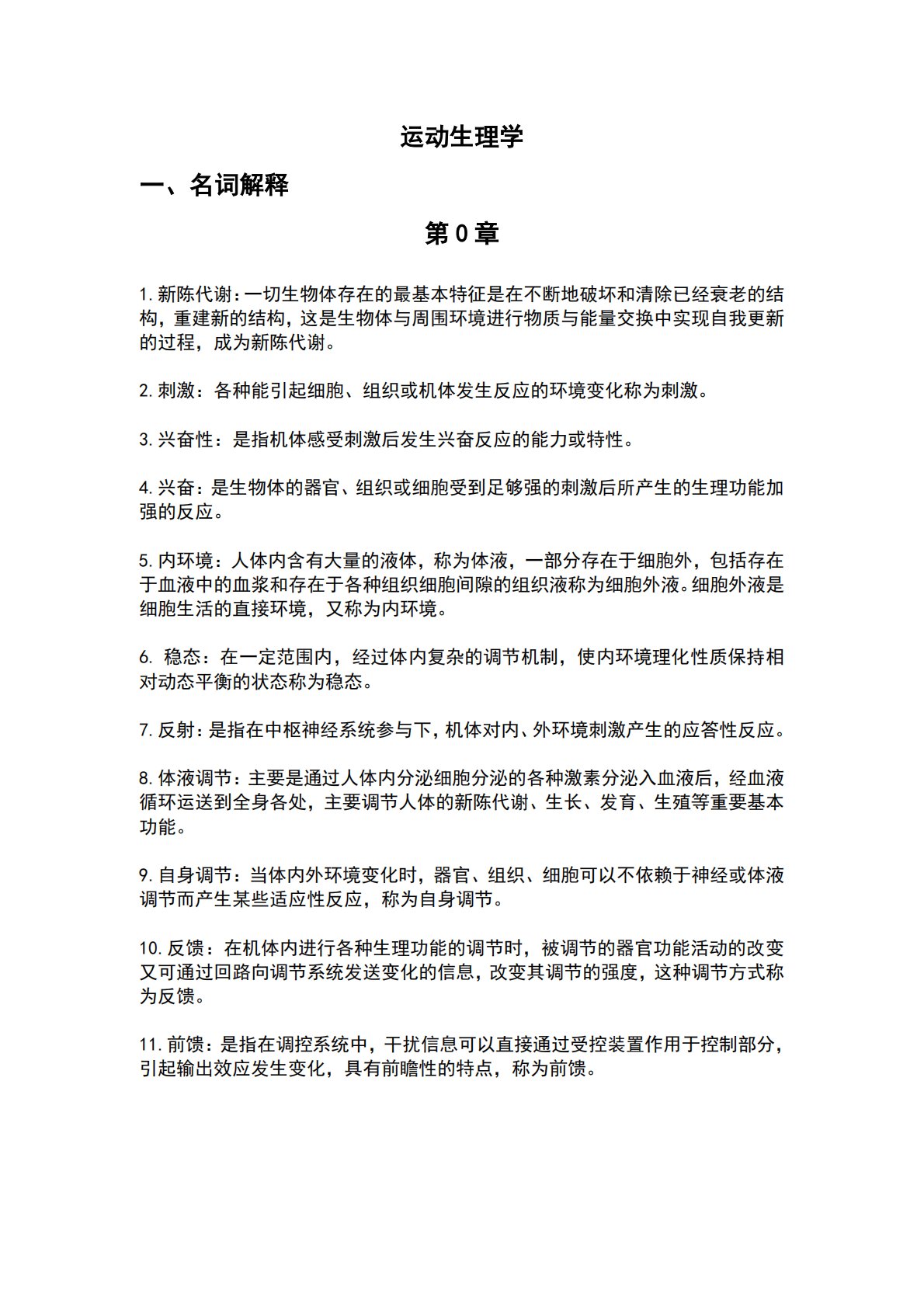 运动生理学一、名词解释第0章1.新陈代谢:一切生物体存在的最基本特征是在不断地破坏和清除已经衰老的结构,重建新的结构,这是生物体与周围环境进行物质与能量交换中实现自我更新的过程,成为新陈代谢。2.刺激:各种能引起细胞、组织或机体发生反应的环境变化称为刺激。3.兴奋性:是指机体感受刺激后发生兴奋反应的能力或特性。4.兴奋:是生物体的器官、组织或细胞受到足够强的刺激后所产生的生理功能加强的反应。5.内环境:人体内含有大量的液体,称为体液,一部分存在于细胞外,包括存在于血液中的血浆和存在于各种组织细胞间隙的组织液称为细胞外液。细胞外液是细胞生活的直接环境,又称为内环境。6.稳态:在一定范围内,经过体...