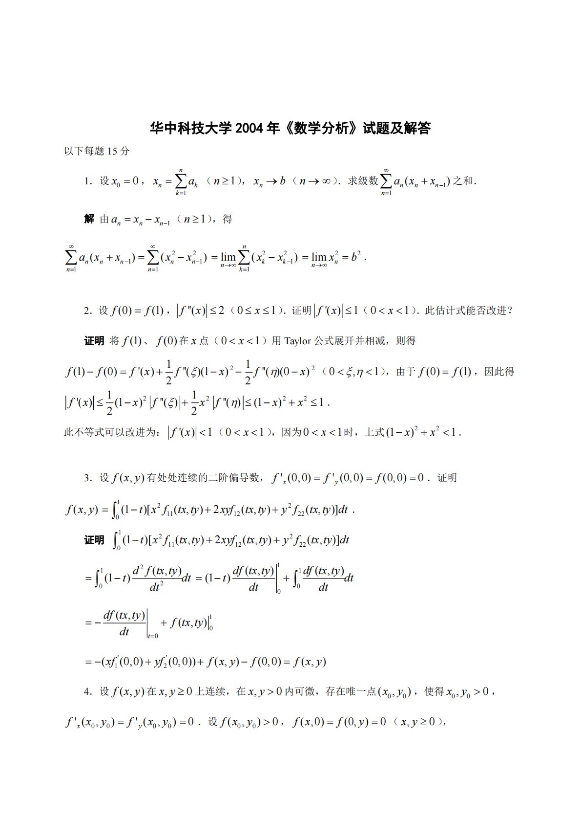 华中科技大学2004年《数学分析》试题及解答以下每题15分nk11.设x00,xnn1ak(n1),xnb(n).求级数an(xnxn1)之和.解由anxnxn1(n1),得n1n1an(xnxn1)nknim1(xn2xn21)lnim(xk2xk21)lxn2b2.2.设f(0)f(1),f''(x)2(0x1).证明f'(x)1(0x1).此估计式能否改进?证明将f(1)、f(0)在x点(0x1)用Taylor公式展开并相减,则得11f(1)f(0)f'(x)2f''()(1x)2...