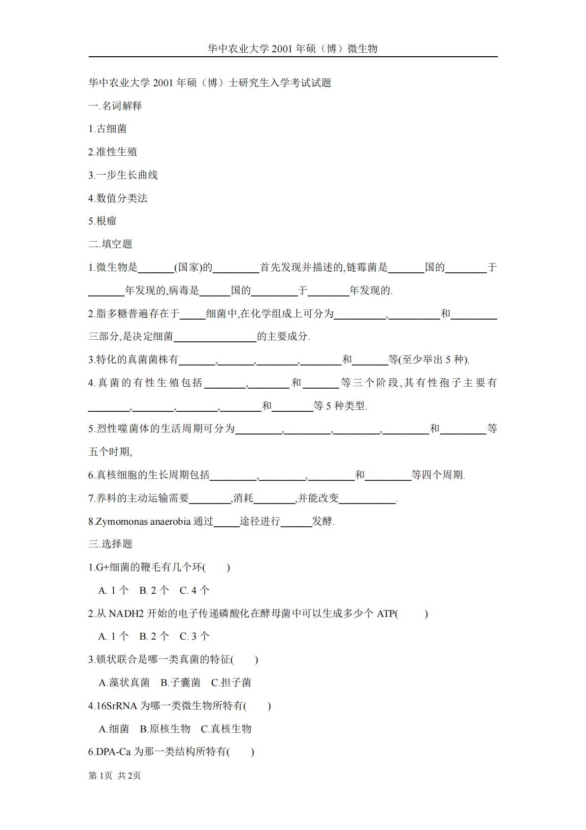 华中农业大学2001年硕(博)微生物第1页共2页华中农业大学2001年硕(博)士研究生入学考试试题一.名词解释1.古细菌2.准性生殖3.一步生长曲线4.数值分类法5.根瘤二.填空题1.微生物是_______(国家)的_________首先发现并描述的,链霉菌是_______国的________于_______年发现的,病毒是______国的_________于________年发现的.2.脂多糖普遍存在于_____细菌中,在化学组成上可分为__________,__________和_________三部分,是决定细菌________________的主要成分.3.特化的真菌菌株有______...