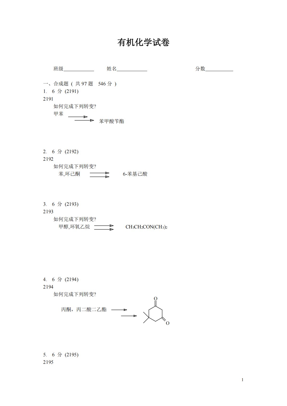 1有机化学试卷班级姓名分数一、合成题(共97题546分)1.6分(2191)2191如何完成下列转变?甲苯苯甲酸苄酯2.6分(2192)2192如何完成下列转变?苯,环己酮6-苯基己酸3.6分(2193)2193如何完成下列转变?甲醇,环氧乙烷CH3CH2CON(CH3)24.6分(2194)2194如何完成下列转变?丙酮,丙二酸二乙酯5.6分(2195)2195OO2如何完成下列转变?甲苯,乙醇p-H2N─C6H4─COOCH2CH2N(C2H5)26.6分(2196)2196如何完成下列转变?苯乙酮,2-溴丙酸乙酯C6H5C(CH3)=C(CH3)COOH7.8分(2197)2197如何完...
