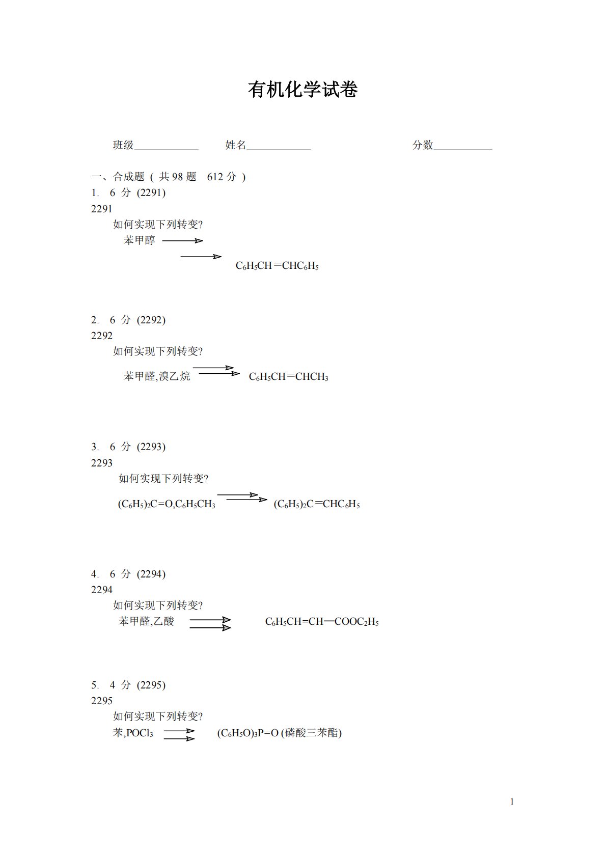 1有机化学试卷班级姓名分数一、合成题(共98题612分)1.6分(2291)2291如何实现下列转变?苯甲醇C6H5CH=CHC6H52.6分(2292)2292如何实现下列转变?苯甲醛,溴乙烷C6H5CH=CHCH33.6分(2293)2293如何实现下列转变?(C6H5)2C=O,C6H5CH3(C6H5)2C=CHC6H54.6分(2294)2294如何实现下列转变?苯甲醛,乙酸C6H5CH=CH─COOC2H55.4分(2295)2295如何实现下列转变?苯,POCl3(C6H5O)3P=O(磷酸三苯酯)26.4分(2296)2296如何实现下列转变?甲苯,POCl3p-(CH3C6H...