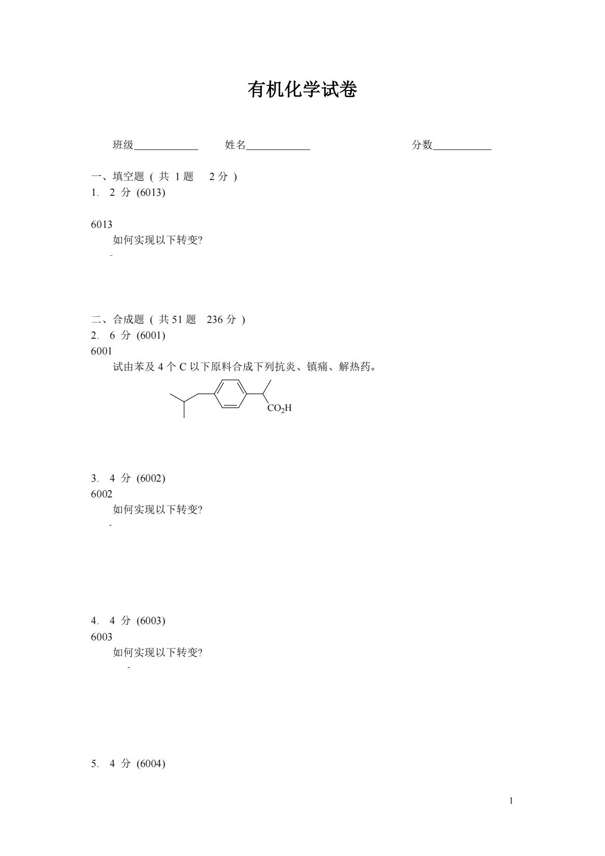 1有机化学试卷班级姓名分数一、填空题(共1题2分)1.2分(6013)6013如何实现以下转变?二、合成题(共51题236分)2.6分(6001)6001试由苯及4个C以下原料合成下列抗炎、镇痛、解热药。3.4分(6002)6002如何实现以下转变?4.4分(6003)6003如何实现以下转变?5.4分(6004)C6H5CHCHC6H5C6H5CHCHC6H5()()反顺CO2HCH3BrCH2BrOHOH()+_26004如何实现以下转变?6.4分(6005)6005如何实现以下转变?CH3CH2C(CH3)=CH2CH3CH2CH(CH3)CH2OCH37.4分(6006)6006如何实...