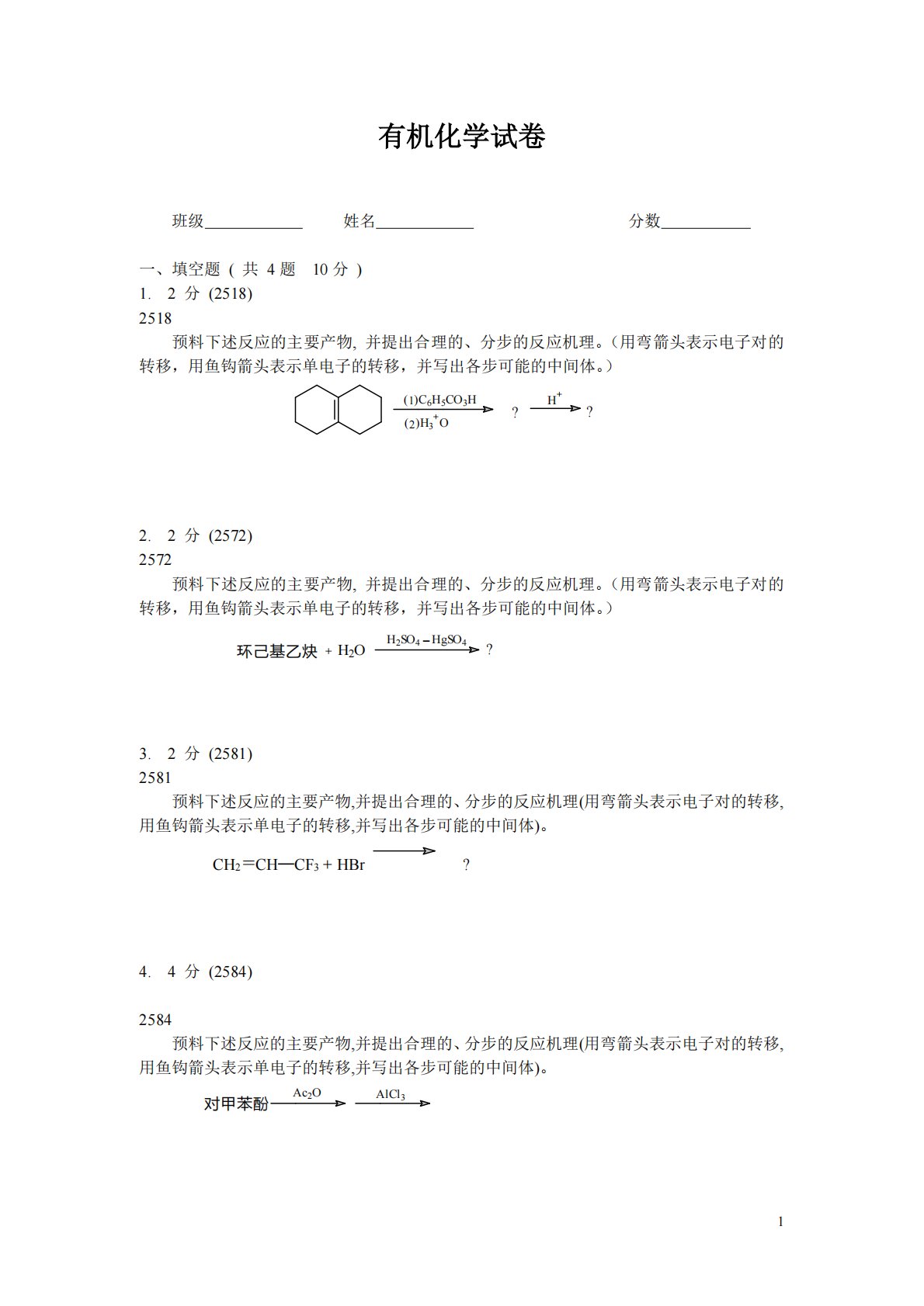 1有机化学试卷班级姓名分数一、填空题(共4题10分)1.2分(2518)2518预料下述反应的主要产物,并提出合理的、分步的反应机理。(用弯箭头表示电子对的转移,用鱼钩箭头表示单电子的转移,并写出各步可能的中间体。)2.2分(2572)2572预料下述反应的主要产物,并提出合理的、分步的反应机理。(用弯箭头表示电子对的转移,用鱼钩箭头表示单电子的转移,并写出各步可能的中间体。)3.2分(2581)2581预料下述反应的主要产物,并提出合理的、分步的反应机理(用弯箭头表示电子对的转移,用鱼钩箭头表示单电子的转移,并写出各步可能的中间体)。CH2=CH─CF3+HBr?4.4分(2584)2584...