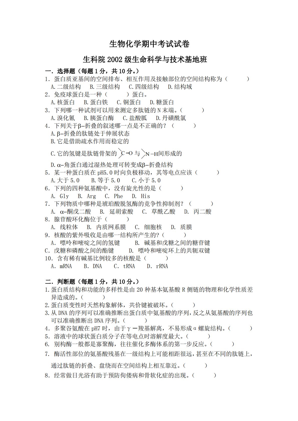 生物化学期中考试试卷生科院2002级生命科学与技术基地班一.选择题(每题1分,共10分。)1.蛋白质亚基间的空间排布、相互作用及接触部位的空间结构称为()A.二级结构B.三级结构C.四级结构D.结构域2.免疫球蛋白是一种()蛋白。A.核蛋白B.蛋白铁C.铜蛋白D.糖蛋白3.下列哪一种试剂可以用来测定多肽链的N末端。()A.溴化氰B.胰蛋白酶C.盐酸胍D.丹磺酰氯4.下列关于折叠的叙述哪一点是不正确的?()A.折叠的肽链处于伸展状态B.它是借助疏水作用而稳定的C.它的氢键是肽链骨架的与间形成的D.角蛋白通过湿热处理可转变成折叠结构5.某一种蛋白质在pH5.0时向负极移动,其等电点...