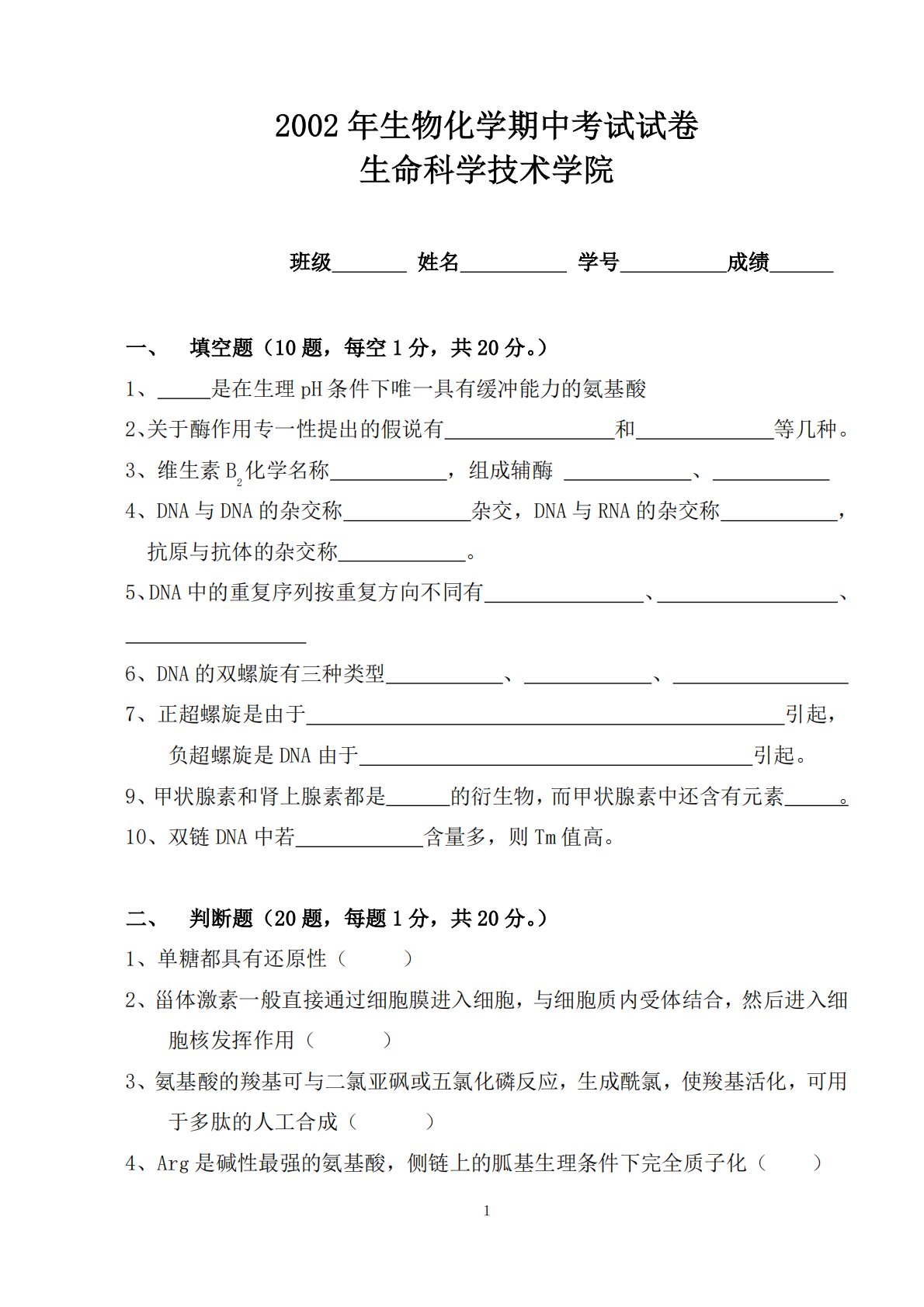12002年生物化学期中考试试卷生命科学技术学院班级姓名学号成绩一、填空题(10题,每空1分,共20分。)1、是在生理pH条件下唯一具有缓冲能力的氨基酸2、关于酶作用专一性提出的假说有和等几种。3、维生素B2化学名称,组成辅酶、4、DNA与DNA的杂交称杂交,DNA与RNA的杂交称,抗原与抗体的杂交称。5、DNA中的重复序列按重复方向不同有、、6、DNA的双螺旋有三种类型、、7、正超螺旋是由于引起,负超螺旋是DNA由于引起。9、甲状腺素和肾上腺素都是的衍生物,而甲状腺素中还含有元素。10、双链DNA中若含量多,则Tm值高。二、判断题(20题,每题1分,共20分。)1、单糖都具有还原性()2、甾...