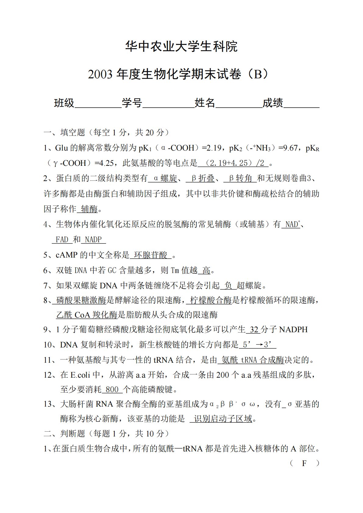 华中农业大学生科院2003年度生物化学期末试卷(B)班级学号姓名成绩一、填空题(每空1分,共20分)1、Glu的解离常数分别为pK1(α-COOH)=2.19,pK2(-+NH3)=9.67,pKR(γ-COOH)=4.25,此氨基酸的等电点是(2.19+4.25)/2。2、蛋白质的二级结构类型有α螺旋、β折叠、β转角和无规则卷曲3、许多酶都是由酶蛋白和辅助因子组成,其中以非共价键和酶疏松结合的辅助因子称作辅酶。4、生物体内催化氧化还原反应的脱氢酶的常见辅酶(或辅基)有NAD+、FAD和NADP5、cAMP的中文全称是环腺苷酸。6、双链DNA中若GC含量越多,则Tm值越高。7、如果双螺旋DNA...