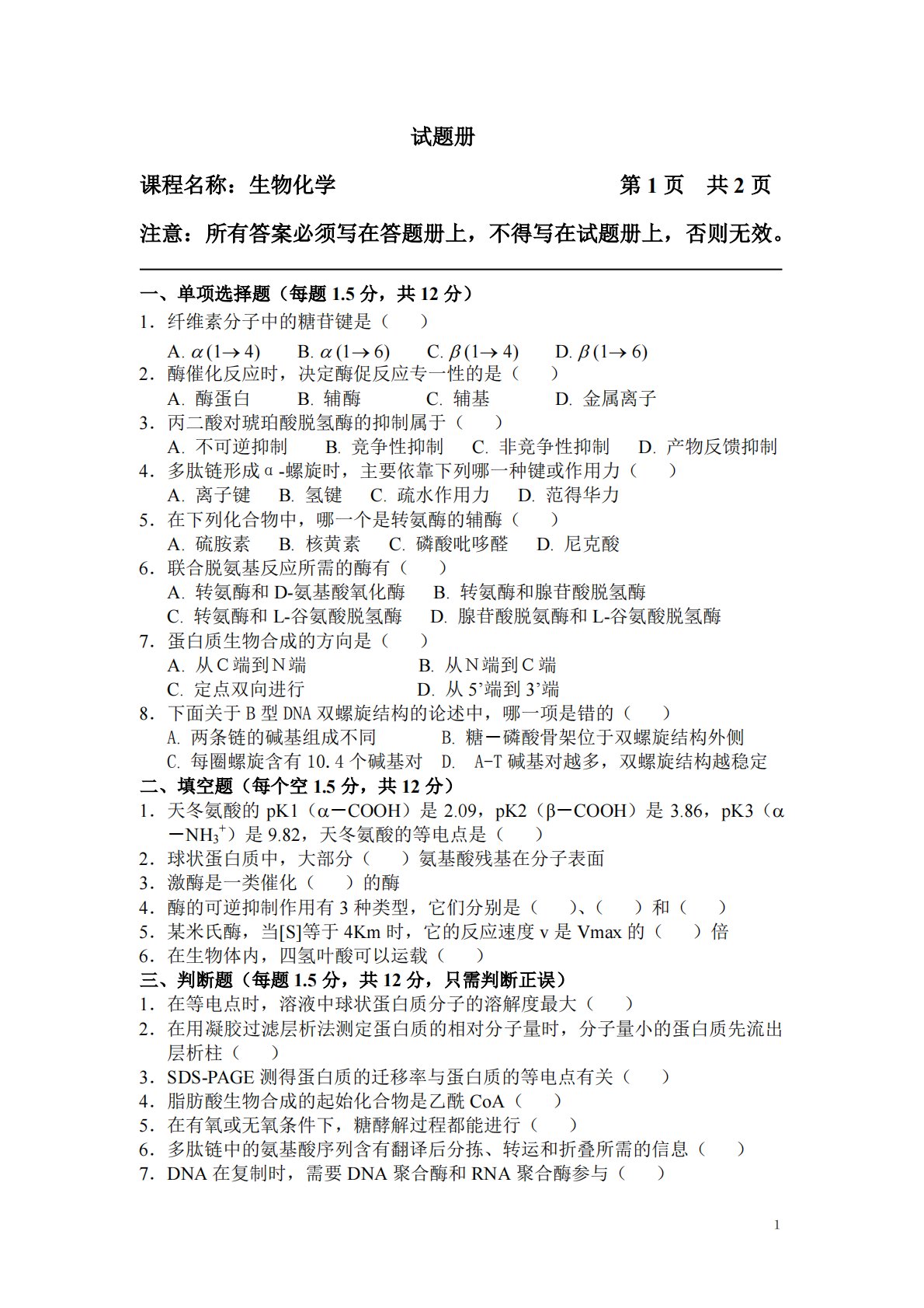 1试题册课程名称:生物化学第1页共2页注意:所有答案必须写在答题册上,不得写在试题册上,否则无效。一、单项选择题(每题1.5分,共12分)1.纤维素分子中的糖苷键是()A.(14)B.(16)C.(14)D.(16)2.酶催化反应时,决定酶促反应专一性的是()A.酶蛋白B.辅酶C.辅基D.金属离子3.丙二酸对琥珀酸脱氢酶的抑制属于()A.不可逆抑制B.竞争性抑制C.非竞争性抑制D.产物反馈抑制4.多肽链形成α-螺旋时,主要依靠下列哪一种键或作用力()A.离子键B.氢键C.疏水作用力D.范得华力5.在下列化合物中,哪一个是转氨酶的辅酶()A.硫胺素B.核黄素C.磷酸吡哆醛D.尼克...