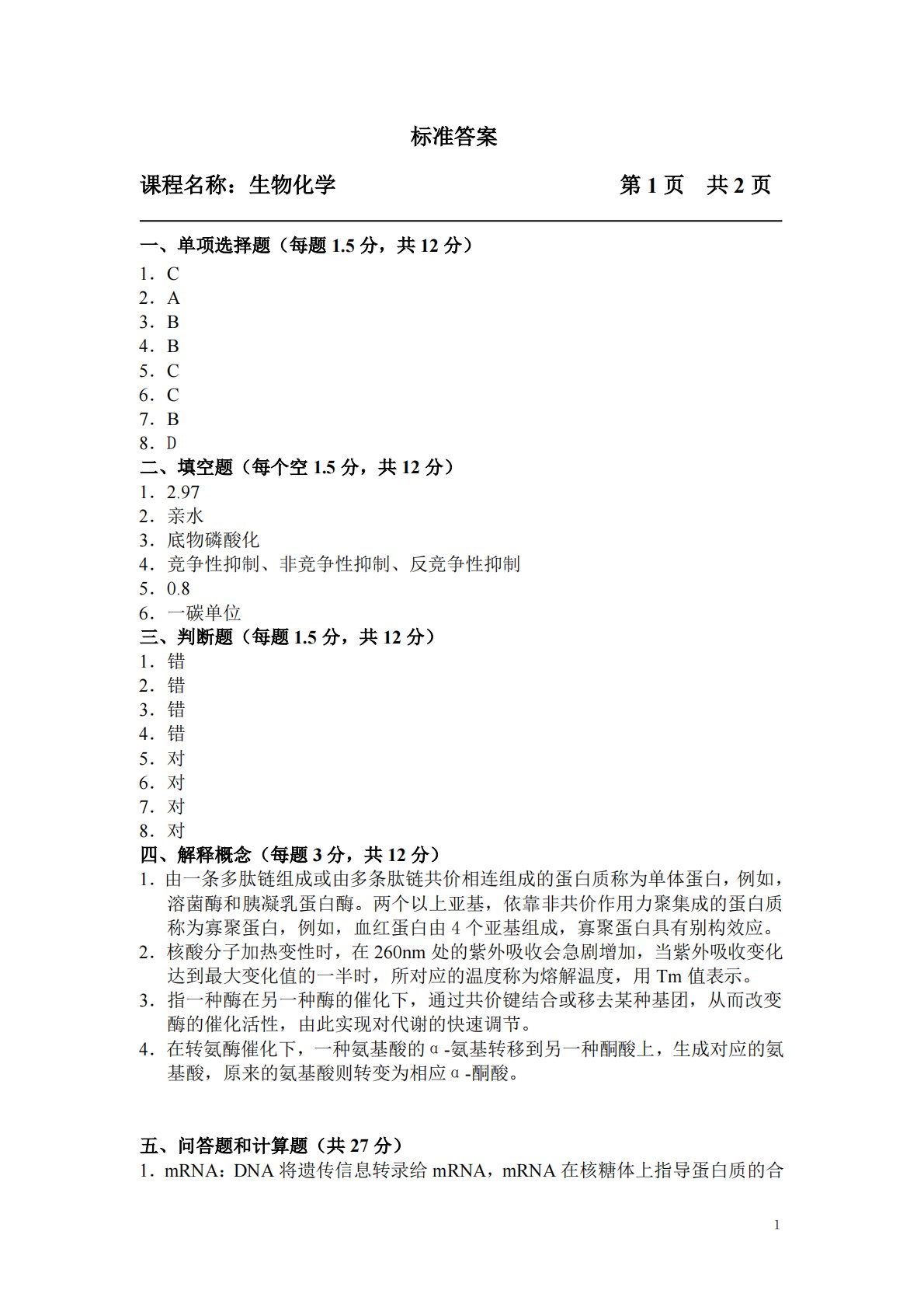 1标准答案课程名称:生物化学第1页共2页一、单项选择题(每题1.5分,共12分)1.C2.A3.B4.B5.C6.C7.B8.D二、填空题(每个空1.5分,共12分)1.2.972.亲水3.底物磷酸化4.竞争性抑制、非竞争性抑制、反竞争性抑制5.0.86.一碳单位三、判断题(每题1.5分,共12分)1.错2.错3.错4.错5.对6.对7.对8.对四、解释概念(每题3分,共12分)1.由一条多肽链组成或由多条肽链共价相连组成的蛋白质称为单体蛋白,例如,溶菌酶和胰凝乳蛋白酶。两个以上亚基,依靠非共价作用力聚集成的蛋白质称为寡聚蛋白,例如,血红蛋白由4个亚基组成,寡聚蛋白具有别构效应。2.核酸分子加...