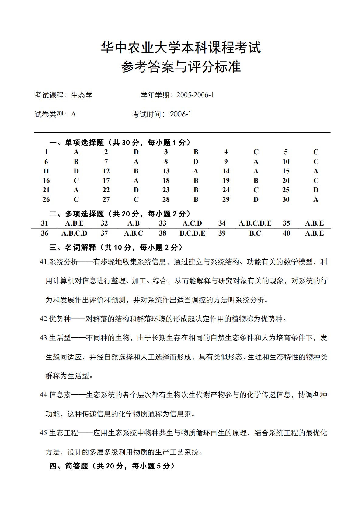 华中农业大学本科课程考试参考答案与评分标准考试课程:生态学学年学期:2005-2006-1试卷类型:A考试时间:2006-1一、单项选择题(共30分,每小题1分)1A2D3B4C5C6B7A8D9A10C11D12B13A14A15A16C17A18B19B20C21A22D23B24C25D26C27C28B29D30A二、多项选择题(共20分,每小题2分)31A.B.E32A.B33A.C.D34A.B.C.D.E35A.B.E36A.B.C.D37A.B.C38B.C.D.E39B.C40A.B.E三、名词解释(共10分,每小题2分)41.系统分析——有步骤地收集系统信息,通过建立与系统...