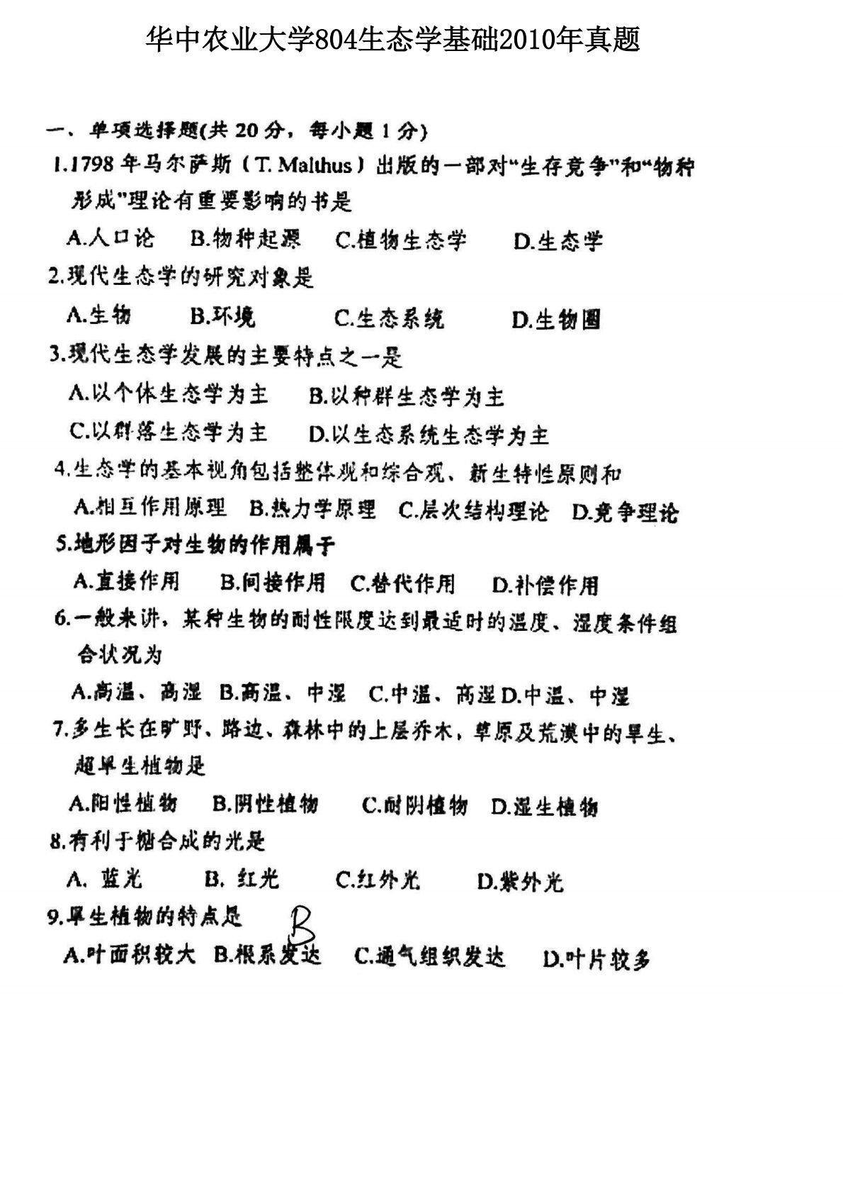 华中农业大学804生态学基础2010年真题