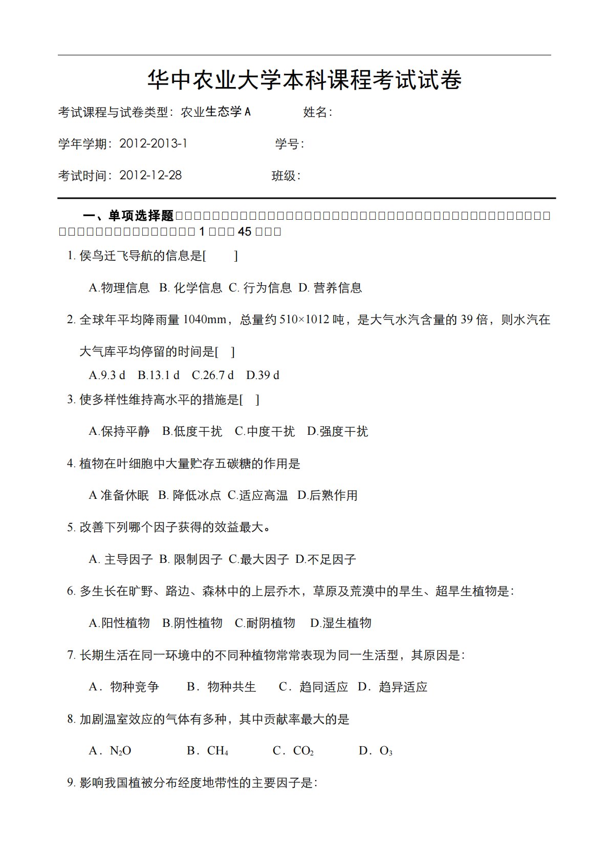 华中农业大学本科课程考试试卷考试课程与试卷类型:农业生态学A姓名:学年学期:2012-2013-1学号:考试时间:2012-12-28班级:一、单项选择题((((((((((((((((((((((((((((((((((((((((((((((((((((((((1(((45(((1.侯鸟迁飞导航的信息是[]A.物理信息B.化学信息C.行为信息D.营养信息2.全球年平均降雨量1040mm,总量约510×1012吨,是大气水汽含量的39倍,则水汽在大气库平均停留的时间是[]A.9.3dB.13.1dC.26.7dD.39d3.使多样性维持高水平的措施是[]A.保持平静B.低度干扰C.中度干扰D...
